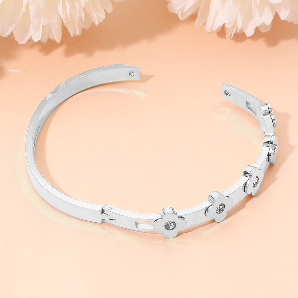 Details • Size : 0.3" H, 2.3" D • Hinged Closure • Elegant bangle bracelet featuring quatrefoil motifs adorned with sparkling crystal details. Designed for timeless style, this bracelet brings sophistication to both everyday looks and special occasions. A versatile accessory that enhances any jewelry collection. • CZ Cubic Zirconia • Stainless Steel