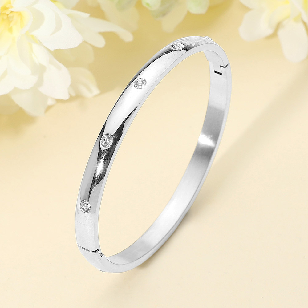 Details • Size : 0.25" H, 2.5" D • Hinged Closure • This stainless steel bangle features a sleek, polished surface adorned with shimmering crystal accents for a refined touch. Its timeless, minimalist design offers both elegance and versatility, making it a perfect accessory to complement day-to-night ensembles with effortless charm. • CZ Cubic Zirconia • Stainless Steel