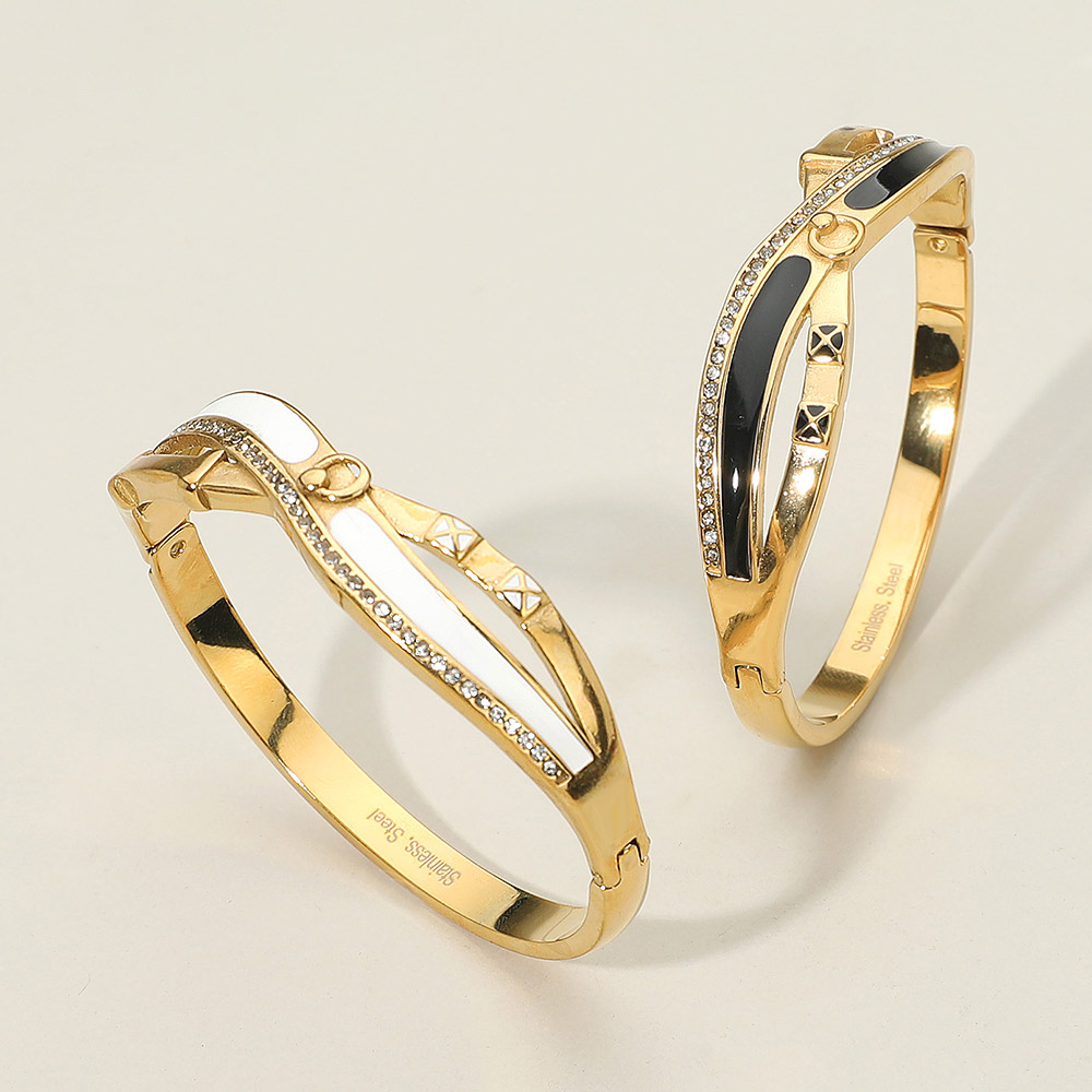 Details • Size : 0.6" H, 2.5" D • Hinged Closure • Modern bangle bracelet featuring geometric detailing and sleek contrasting inlay with a sparkling accent line. Designed with a secure hinged closure, this sophisticated piece adds a refined edge to both everyday looks and evening ensembles. • CZ Cubic Zirconia • Stainless Steel