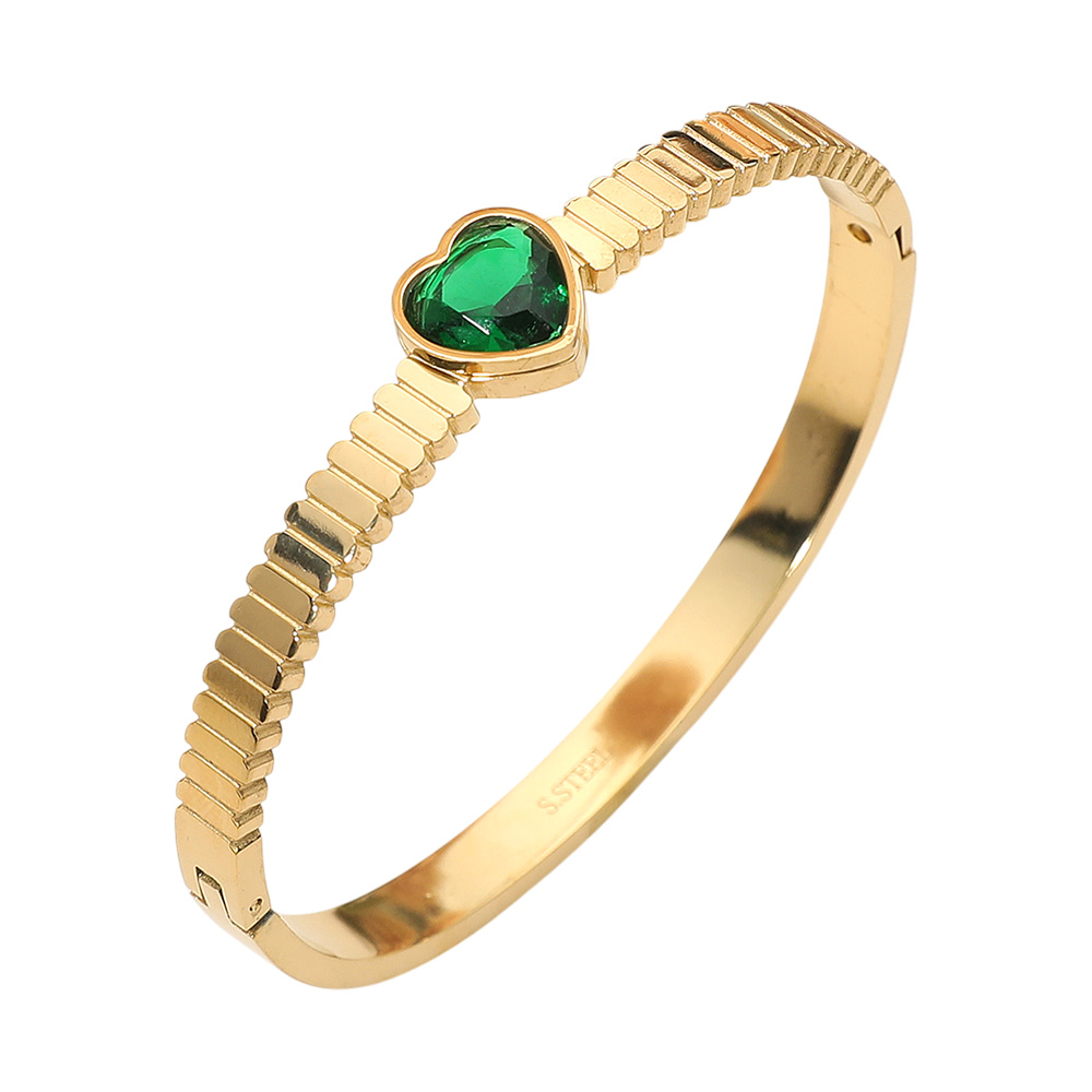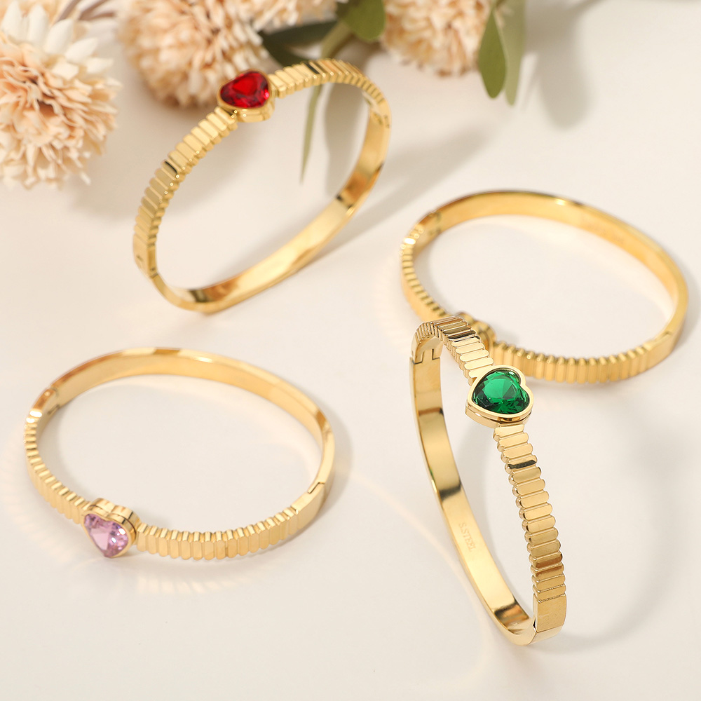 Stainless Steel Heart Stone Accent Hinged Bangle Bracelet