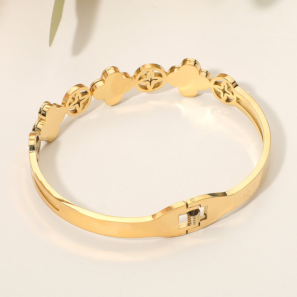 Details • Size : 0.5" H, 2.4" D • Hinged Closure • Add a touch of charm with this quatrefoil hinged bangle bracelet. Featuring alternating filled and open clover motifs, this elegant piece offers a refined look perfect for layering or wearing solo. A stylish bracelet that combines symbolic design with timeless elegance. • Stainless Steel