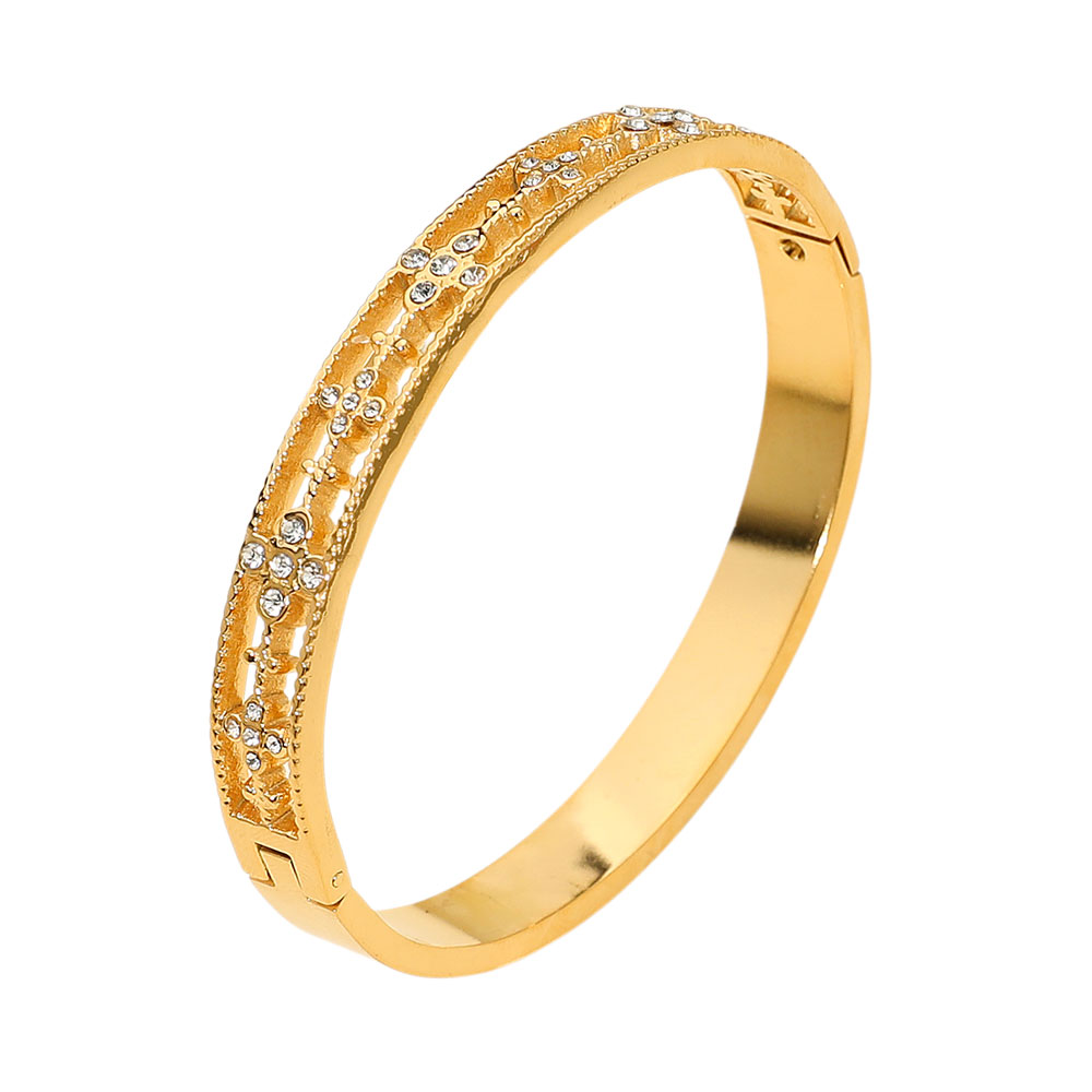 Stainless Steel Stone Accent Floral Hinged Bangle Bracelet