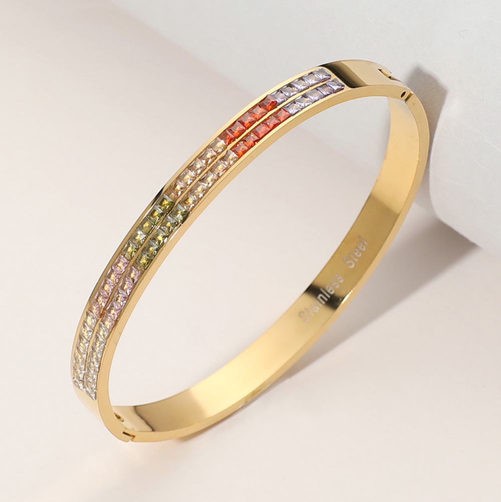 Details • Size : 0.25" H, 2.3" D • Hinged Closure • Sleek stainless steel bangle bracelet featuring a double row of square-cut crystals. A refined, modern accessory perfect for stacking or wearing solo. Durable and stylish for everyday wear. • Stainless Steel