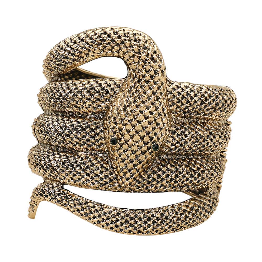 Details • Size : 2.75" H, 2.25" D • Hinged Closure • Striking coiled snake bracelet featuring a detailed serpent wrap design with textured scales and bold sculptural form. This statement cuff adds a fierce, fashion-forward edge to any outfit, perfect for showcasing confidence and individuality in both casual and evening looks. • Lead and Nickel Compliant