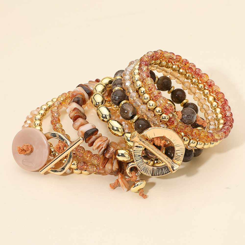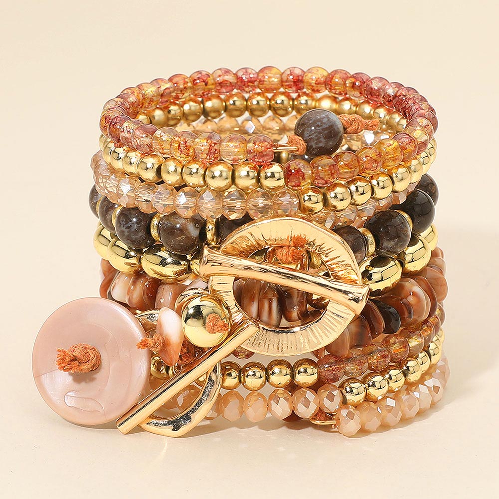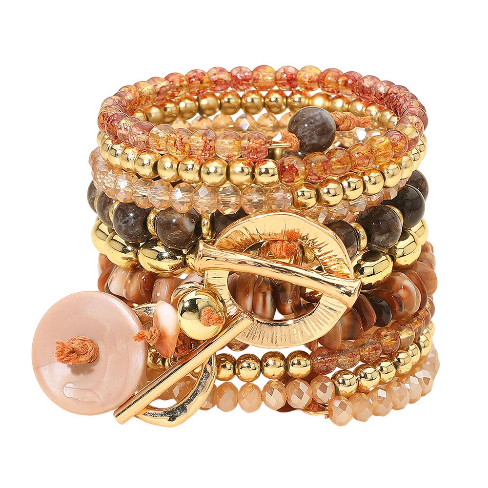 Details • Size : 3" H, 2.4" D • Adjustable • Multi-layer beaded bracelet stack featuring mixed bead textures and a stylish toggle charm accent. Adjustable design makes it perfect for everyday wear, gifting or adding boho-inspired detail to casual and dressy outfits. A versatile accessory with rich, eye-catching dimension. • Lead and Nickel Compliant