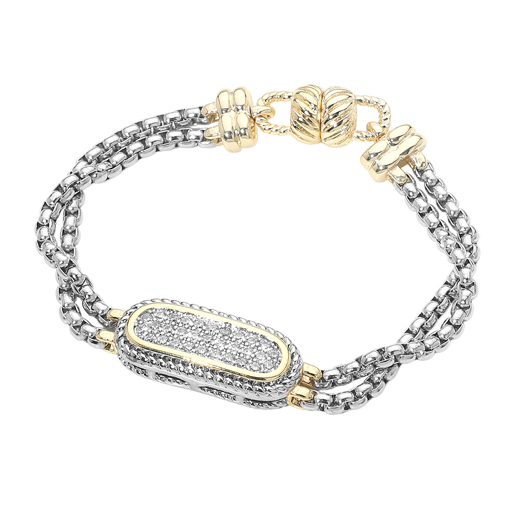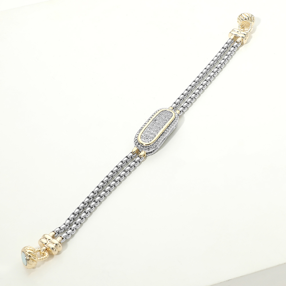 14K Gold Plated Two Tone CZ Pave Oval Bar Accent Layered Magnetic Bracelet