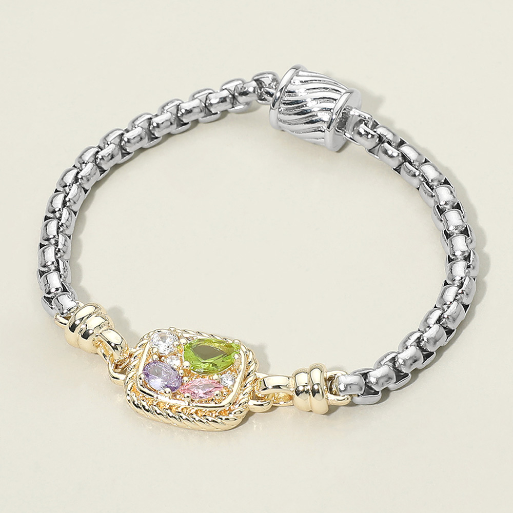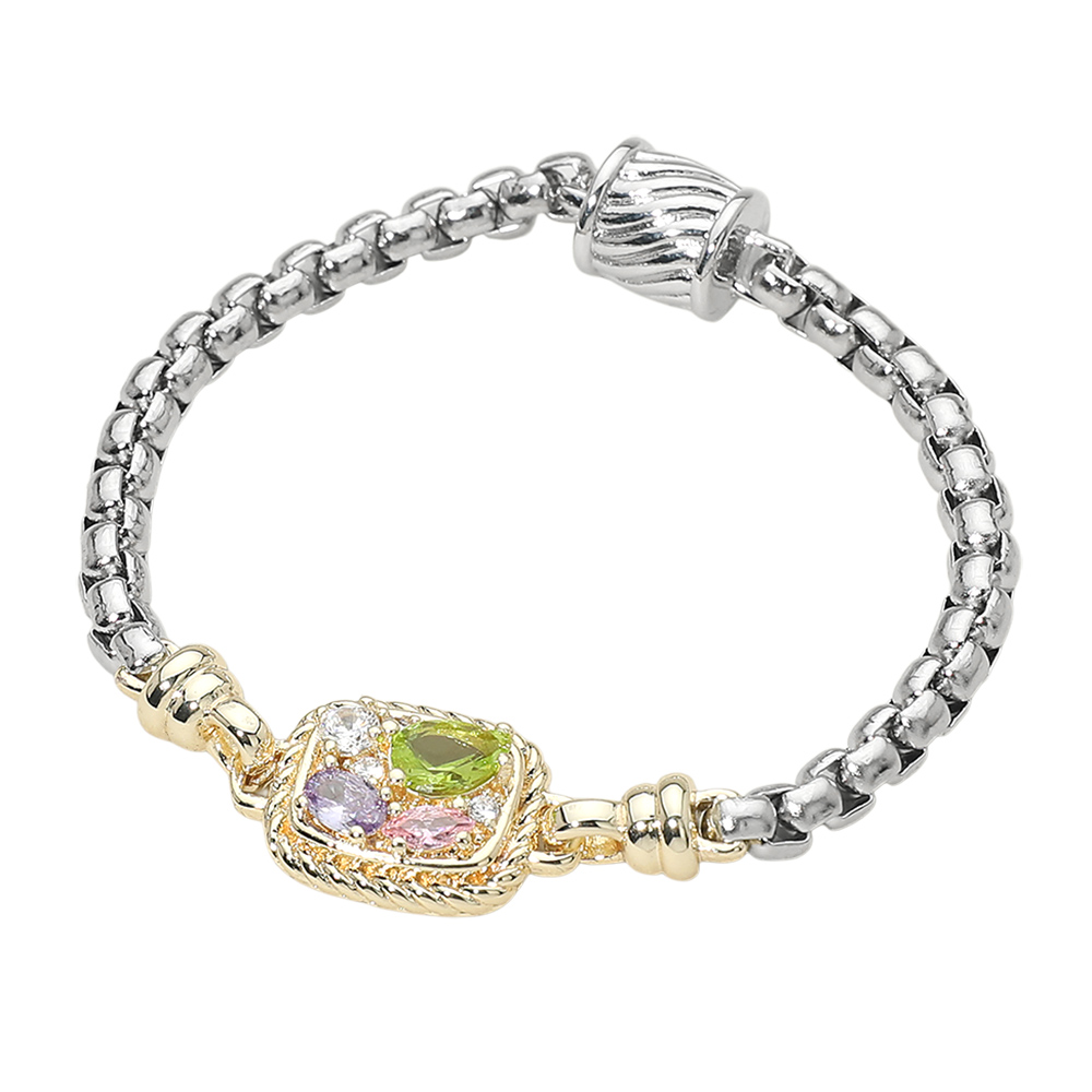 Details • Size : 0.8" H, 7" L • Magnetic Closure • Statement link bracelet featuring a CZ stone embellished charm plate and a secure magnetic closure. Designed for effortless wear, this bracelet combines bold structure with elegant sparkle, making it perfect for everyday styling, gifting, or layering with other bracelets for a polished, modern look. • CZ Cubic Zirconia • Gold Dipped