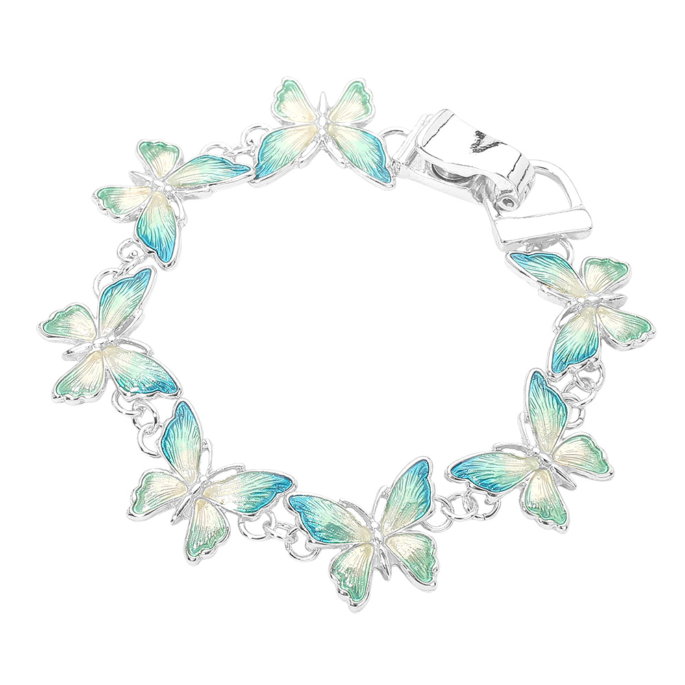 • Elegant butterfly link bracelet featuring detailed wing-shaped charms connected in a graceful silhouette. Designed for boutiques, gift shops, and seasonal collections, this nature-inspired bracelet adds whimsical movement and feminine charm to everyday outfits and special occasion accessory assortments.