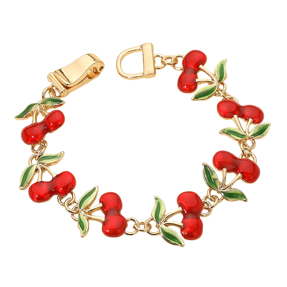 Details • Size : 0.6" H, 7" + 0.7" L • Magnetic Closure • Vibrant cherry charm bracelet featuring detailed fruit and leaf designs for a cheerful look. Lightweight and fun, this accessory is perfect for casual outfits, summer style, or gifting. A delightful bracelet that adds personality, charm, and a touch of whimsy to any jewelry collection. • Lead and Nickel Compliant