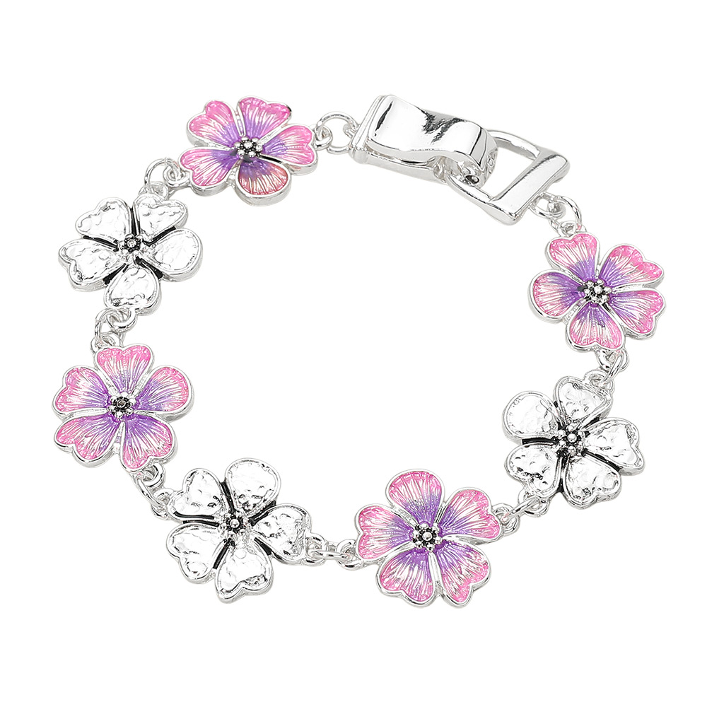 Details • Size : 0.7" H, 7" + 0.5" L • Magnetic Closure • Elegant floral charm bracelet featuring linked flower accents and a secure magnetic clasp. Designed with sculpted petal details and a polished finish, this bracelet adds a graceful touch to everyday outfits, gifting collections, and seasonal accessory assortments with effortless wear appeal. • Lead and Nickel Compliant