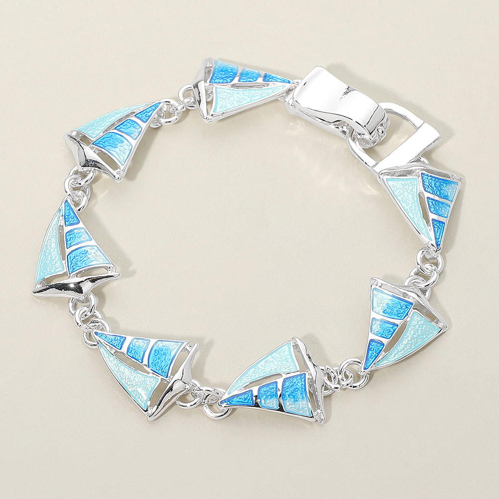 Details • Size : 0.6" H, 7" + 0.5" L • Magnetic Closure • Nautical sailboat charm bracelet designed with linked sail motifs that create a playful, seaside-inspired look. Ideal for beach boutiques, resort shops, cruise gift stores, and summer collections, this bracelet brings a breezy coastal feel to everyday wear and vacation-ready styling. • Lead and Nickel Compliant