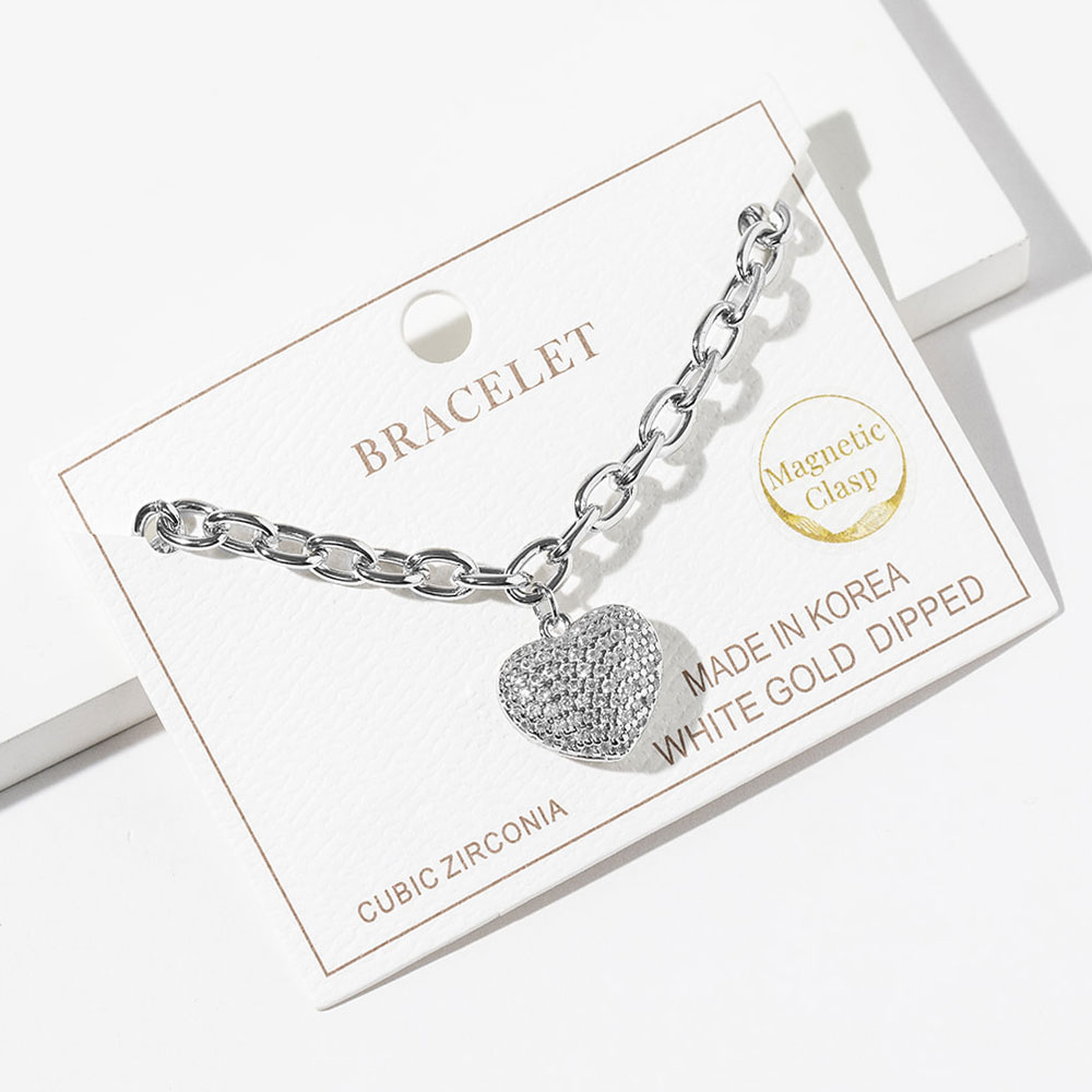 White Gold Dipped CZ Stone Paved Puffy Heart Charm Magnetic Chain Bracelet