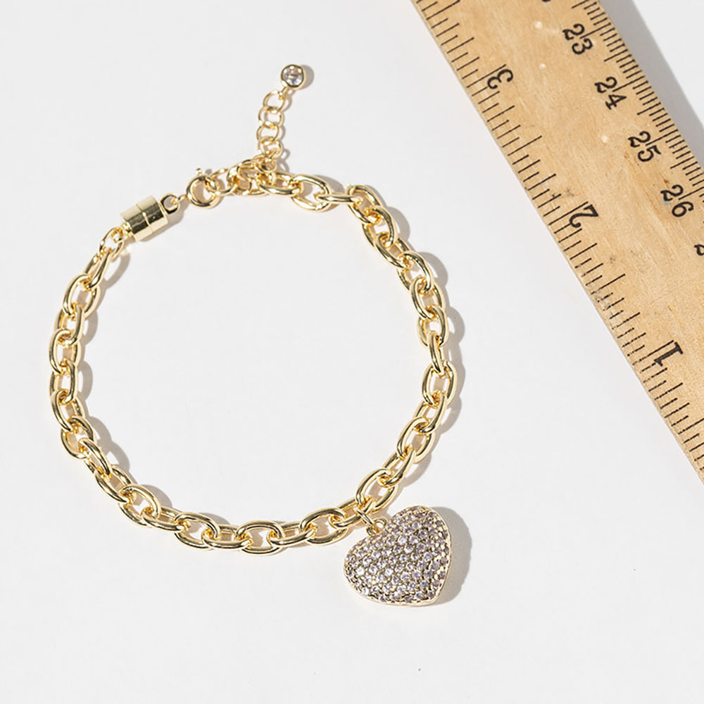Gold Dipped CZ Stone Paved Puffy Heart Charm Magnetic Chain Bracelet