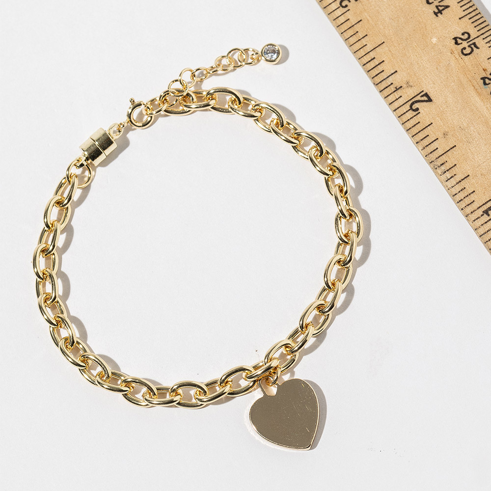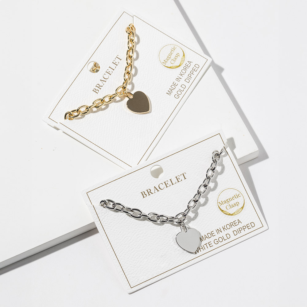 Details • Size : 0.25" H, 7" + 1" L • Charm Size : 0.6" X 0.7" • Magnetic Clasp Closure • Chic chain bracelet featuring a smooth heart charm and a secure magnetic clasp for effortless wear. Its timeless design complements everyday looks and adds a delicate hint of romance to any outfit, making it a perfect piece to stack, style, or gift for special occasions. • Lead and Nickel Compliant • Made In Korea • Gold Dipped