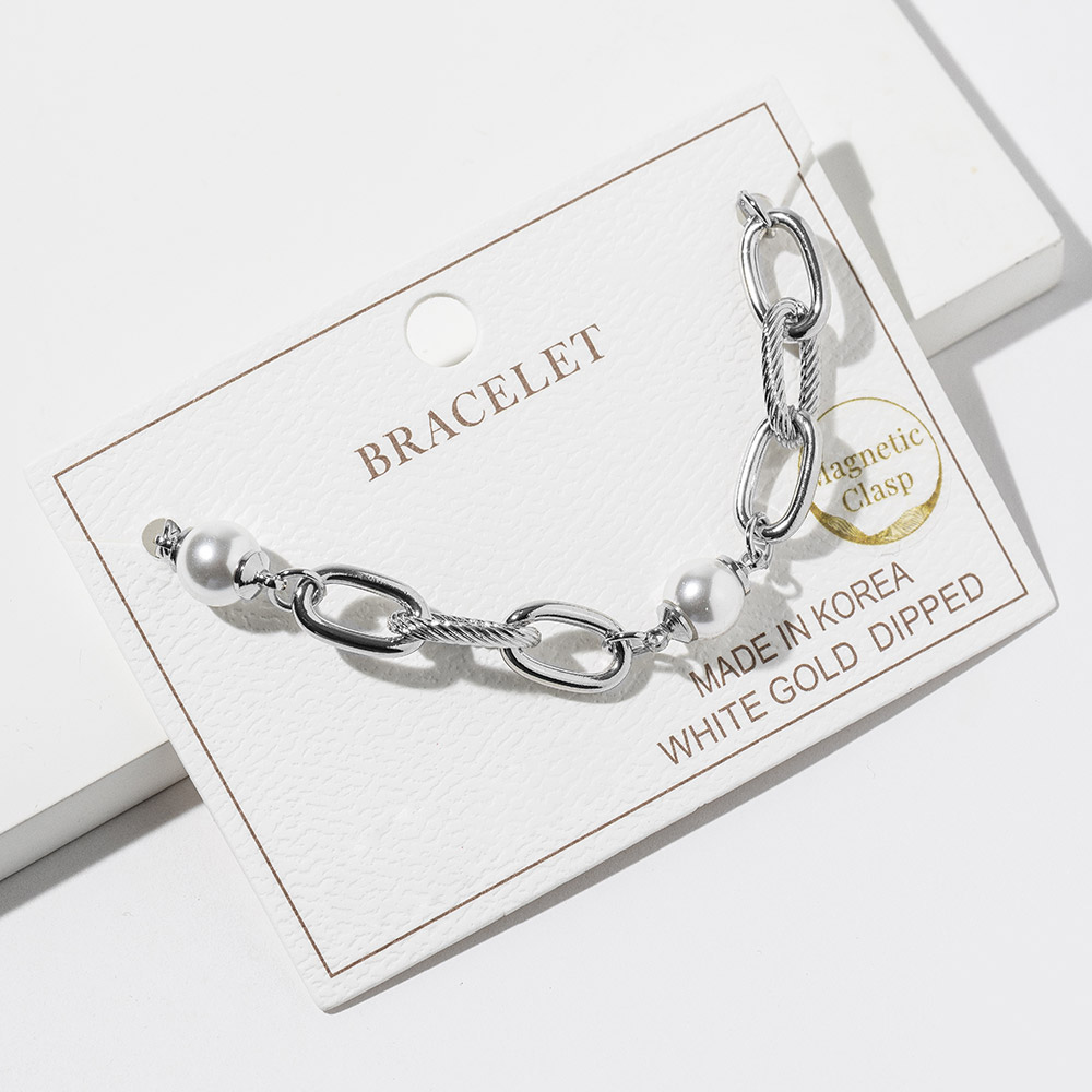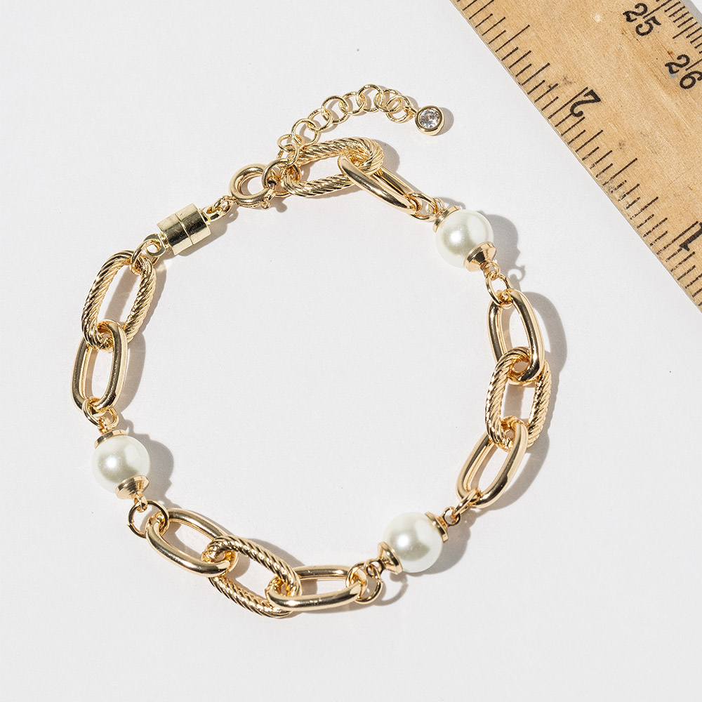 Details • Size : 0.3" H, 7" + 1" L • Magnetic Clasp Closure • Elevate your style with this chunky link bracelet featuring smooth pearl-style accents and a secure magnetic clasp for effortless wear. A bold yet elegant accessory designed to complement everyday outfits and special looks alike, offering a chic touch with timeless charm and modern appeal. • Gold Dipped • Lead and Nickel Compliant • Made In Korea