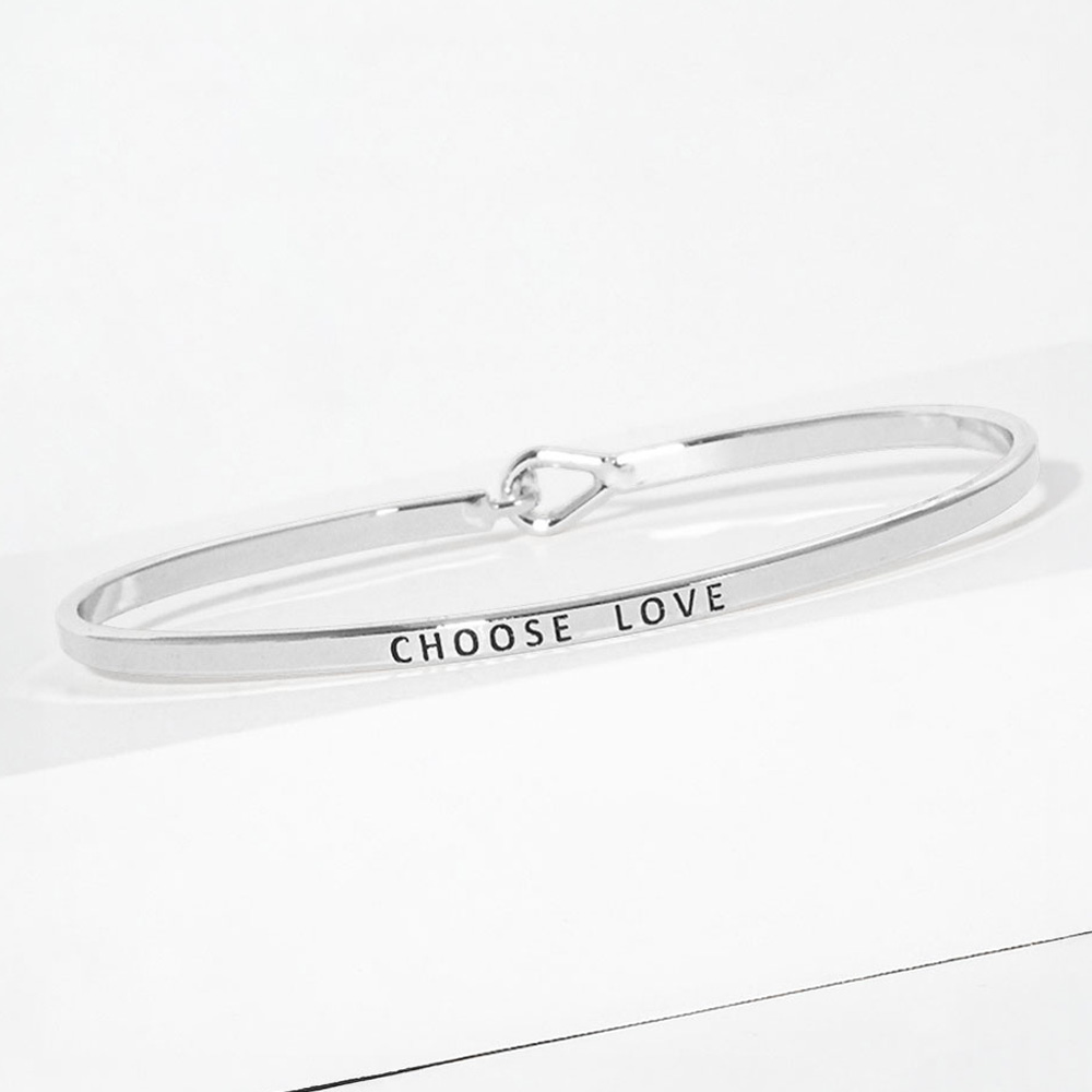 Details • Size : 0.2" H, 2.5" D • Hook Closure • Wear a daily reminder of kindness with this elegant bracelet engraved with "CHOOSE LOVE." Its minimal, timeless design and secure closure make it ideal for everyday wear or as a meaningful gift. A stylish expression of compassion and inner strength. • Lead and Nickel Compliant • Brass