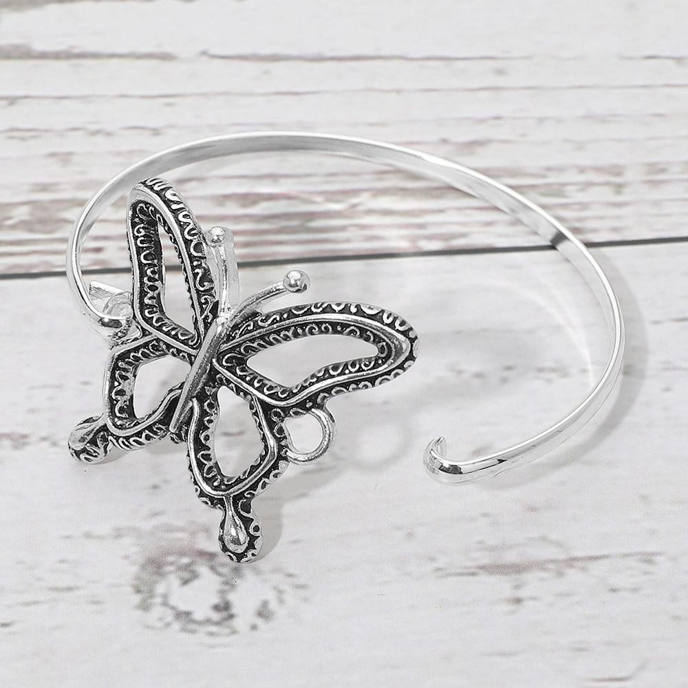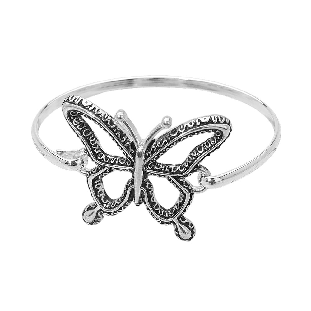 Details • Size : 1.3" H, 2.5" D • Hook Closure • This open bangle bracelet features a detailed butterfly centerpiece with sculpted contours that create a delicate yet eye-catching look. Designed for easy styling, it adds a graceful accent to everyday outfits or special occasion wear. Ideal for boutiques seeking symbolic jewelry that feels light, expressive, and versatile for layering or solo wear. • Lead and Nickel Compliant