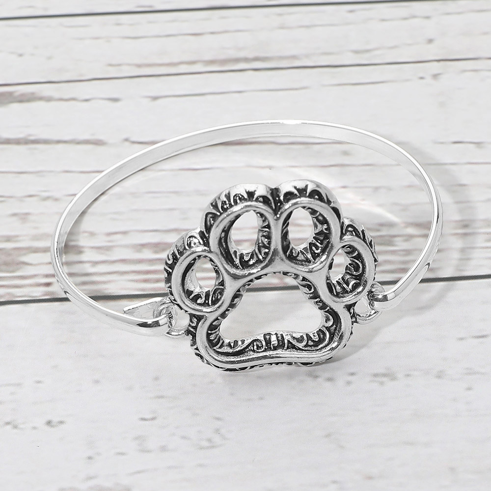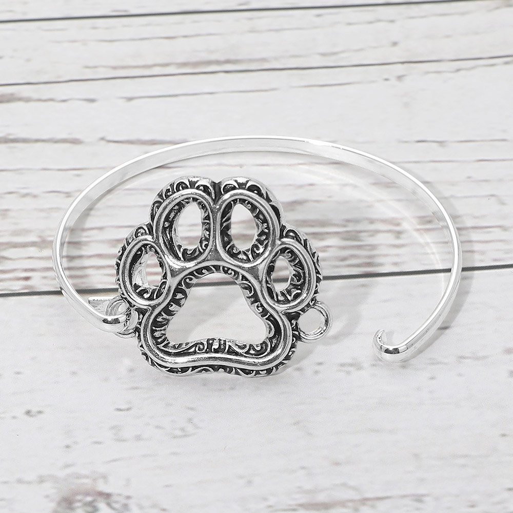 Details • Size : 1.3" H, 2.5" D • Hook Closure • This open cuff bracelet showcases a detailed paw print design that celebrates love for pets and animal-inspired style. The sleek bangle silhouette offers easy wear and a comfortable fit, making it ideal for everyday outfits or heartfelt gifting. A meaningful accessory that resonates with pet lovers and adds symbolic charm to boutique jewelry collections. • Lead and Nickel Compliant
