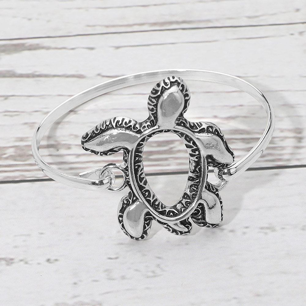 Details • Size : 1.7" H, 2.5" D • Hook Closure • This open bangle bracelet features a graceful sea turtle motif symbolizing protection, longevity, and ocean-inspired beauty. Designed with a sleek bangle silhouette for easy wear, it pairs effortlessly with casual or resort-ready looks. A meaningful accessory for beach lovers, nature-inspired collections, and gift-ready boutique jewelry assortments. • Lead and Nickel Compliant