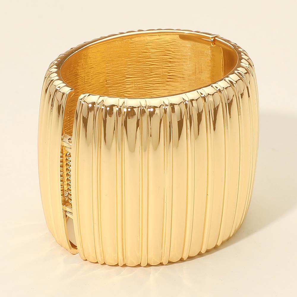Details • Size : 2.25" H, 2.5" D • Hinged Closure • Bold statement band ring featuring a wide silhouette with ribbed texture for a structured, modern look. Designed to stand out worn solo or layered with other rings, this piece adds confident style and sculptural appeal to everyday outfits or elevated occasions. • Lead and Nickel Compliant
