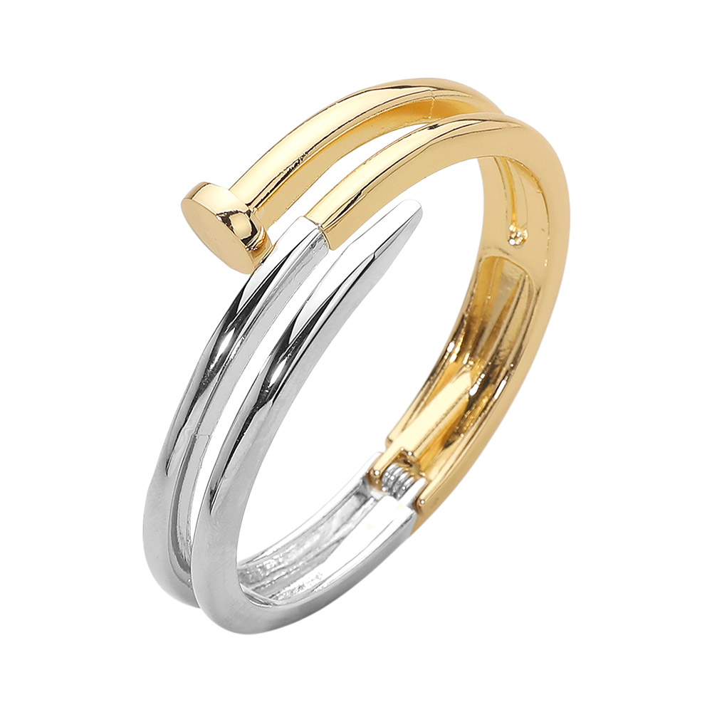 Details • Size : 1" H, 2.5" D • Hinged Closure • Contemporary double coil nail head bangle bracelet crafted with sleek curves for a bold, modern aesthetic. This stylish bracelet wraps elegantly around the wrist, offering a chic statement piece perfect for both casual and formal looks. A unique design that adds edge and sophistication to any outfit. • Lead and Nickel Compliant