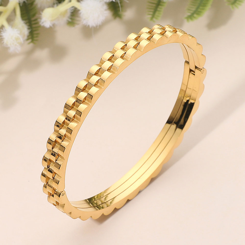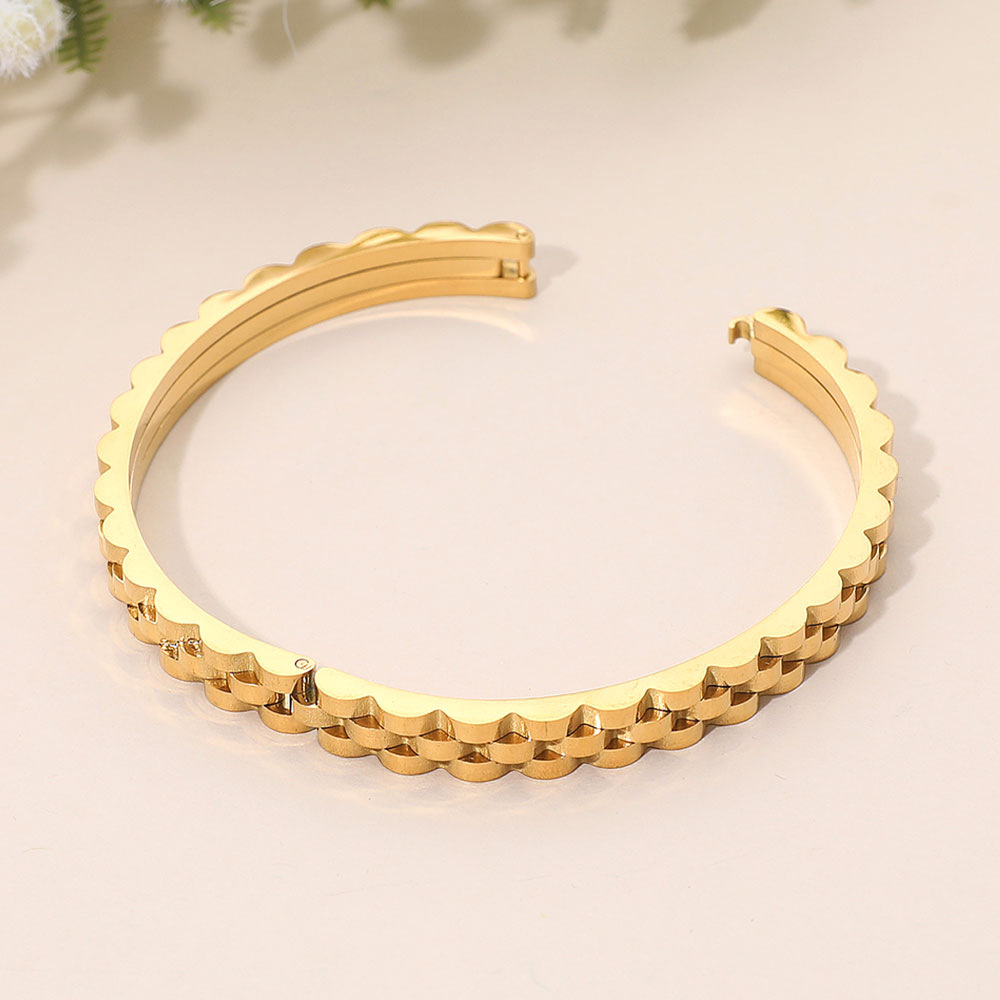 • Contemporary hinge bangle bracelet showcasing a chain-link textured edge for bold dimension and refined shine. Designed to complement everyday styling or elevate polished evening looks, this versatile statement piece stands out worn solo or stacked with coordinating bracelets.