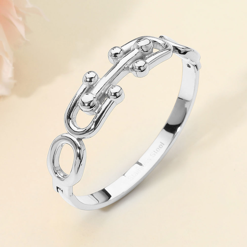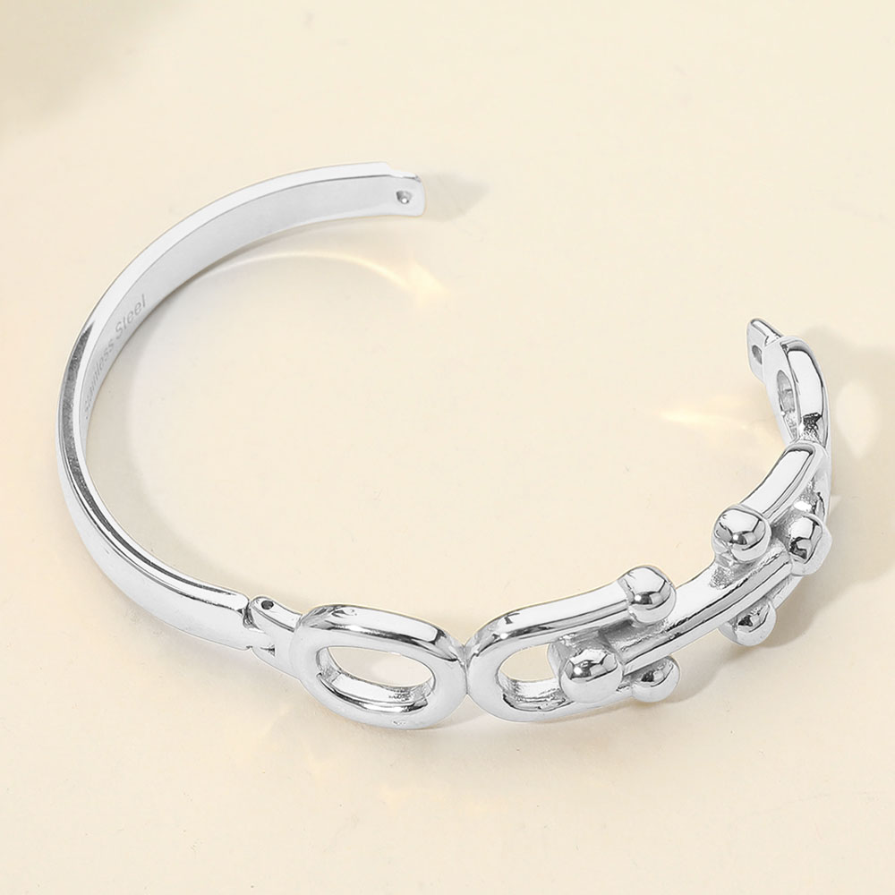 Details • Size : 0.7" H, 2.3" D • Hinged Closure • Bold hinged bracelet featuring sculpted chain link details with smooth rounded accents. Designed for easy on and off wear, this bracelet delivers a strong yet refined look that elevates everyday outfits. Ideal for stacking or wearing solo, it’s a versatile statement piece for modern accessory collections. • Stainless Steel
