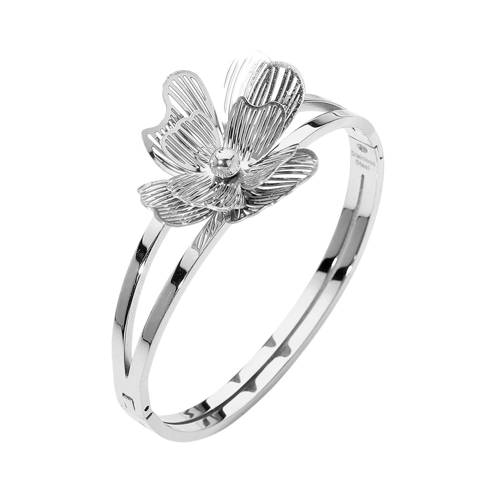 Details • Size : 1.25" H, 2.3" D • Hinged Closure • Elegant hinged bracelet featuring a sculpted floral design that adds dimension and refined style to any look. The hinged opening allows easy on and off while maintaining a secure, comfortable fit. A standout accessory ideal for boutique displays, gift selections, and fashion-forward collections seeking timeless yet distinctive appeal. • Stainless Steel