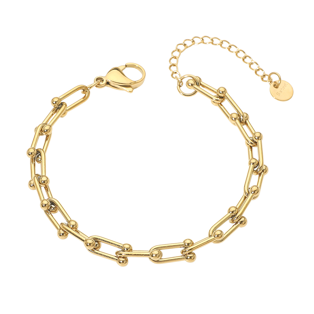 Details • Size : 0.25" H, 7.5" + 2.25" L • Lobster Clasp Closure • This stainless steel industrial link chain bracelet features a sleek, structured design accented with subtle rounded details for added dimension. Designed for everyday wear, it offers a refined statement that pairs effortlessly with casual or elevated looks. Perfect for stacking or wearing solo, it brings a clean, contemporary touch to any jewelry assortment. • Stainless Steel