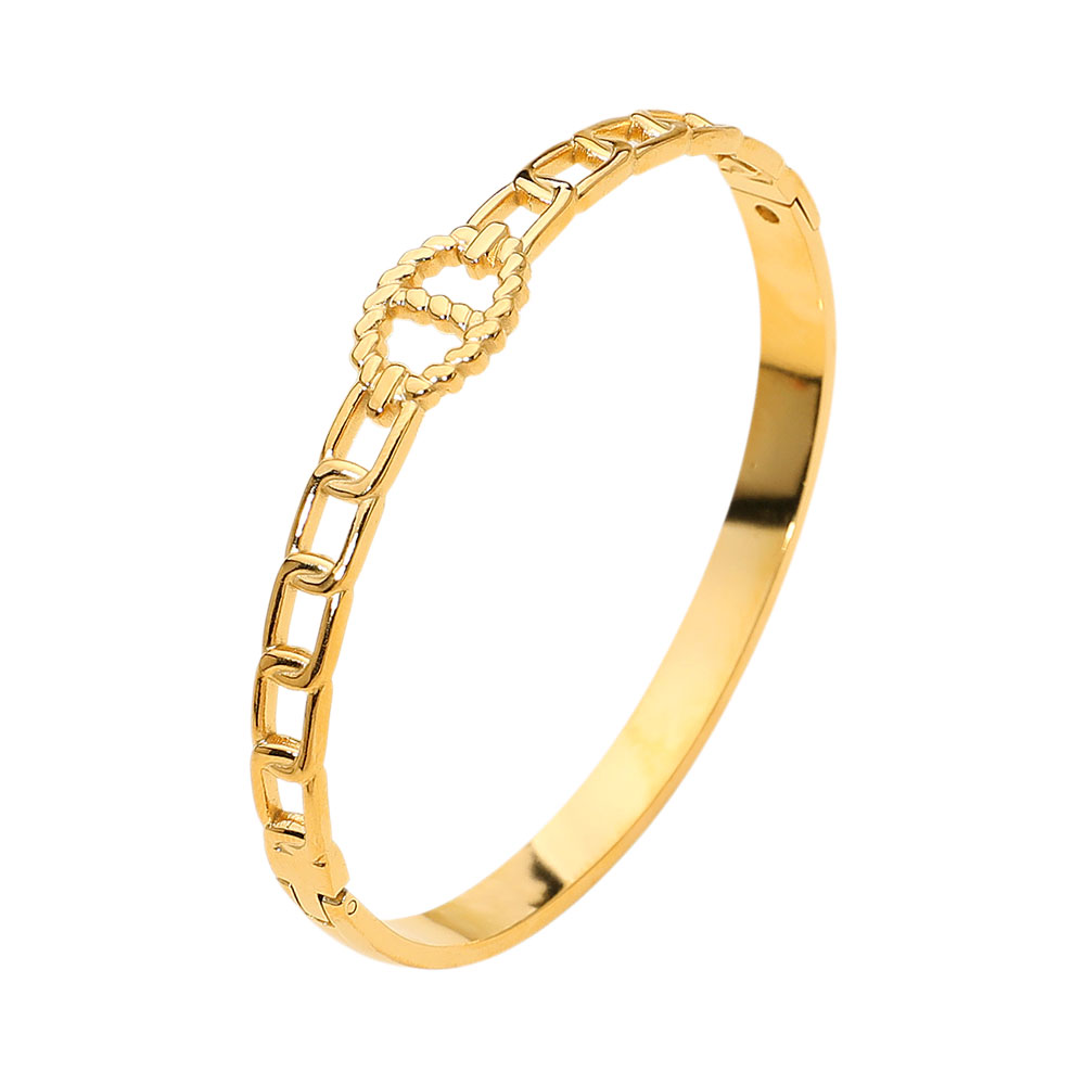 • A refined hinged bangle accented with elegant link-inspired detailing for a modern, sculptural look. Designed for effortless wear and a secure fit, this bracelet brings subtle statement style that layers beautifully or stands out on its own for everyday or dressy occasions.