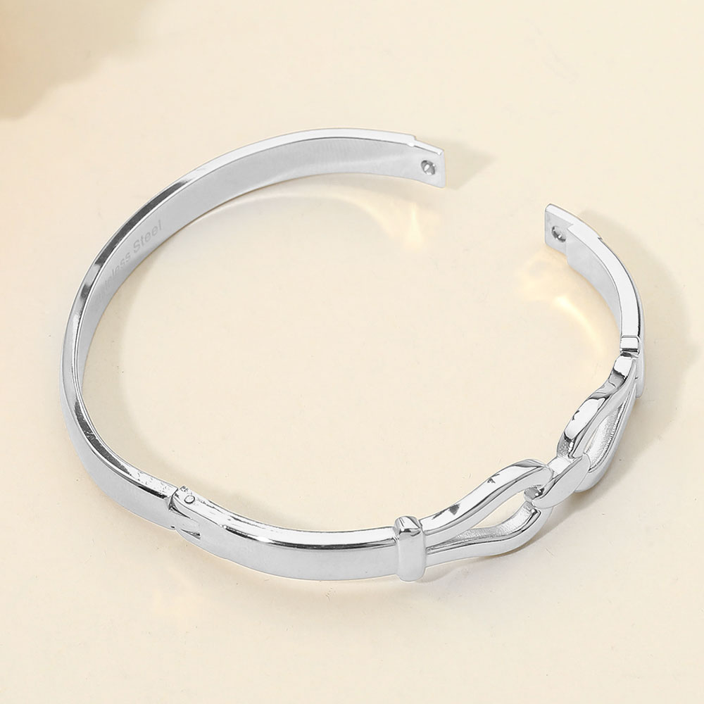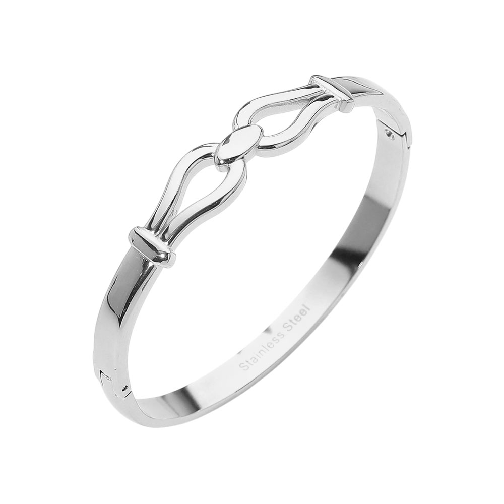 Details • Size : 0.4" H, 2.3" D • Hinged Closure • Sleek hinged bracelet featuring sculpted link detailing for a clean, contemporary look. Designed for easy wear with a secure hinged closure, this bracelet offers a polished silhouette that works perfectly alone or stacked. A versatile accessory ideal for everyday styling, gifting, and trend-focused retail collections. • Stainless Steel