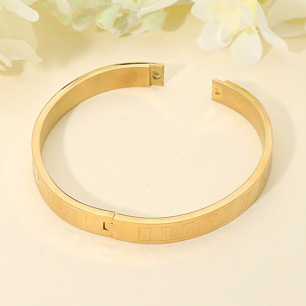 Details • Size : 0.3" H, 2.5" D • Hinged Closure • This stainless steel bangle showcases engraved Roman numerals that add a classic, timeless charm to its sleek, polished design. Elegant yet modern, it’s perfect for everyday sophistication or layering with other pieces to create a bold, personalized statement of refined contemporary style. • Stainless Steel
