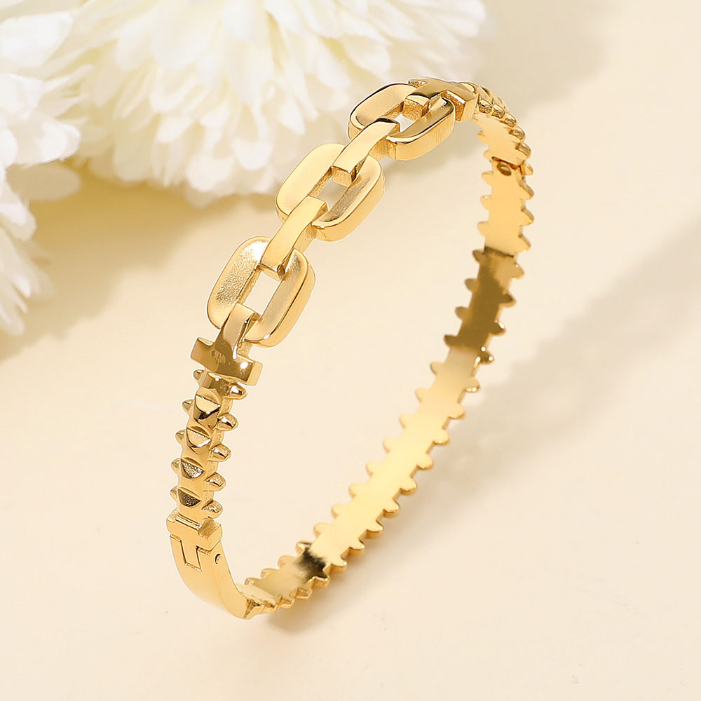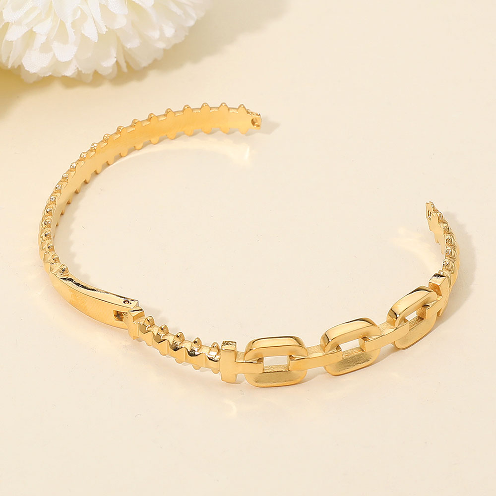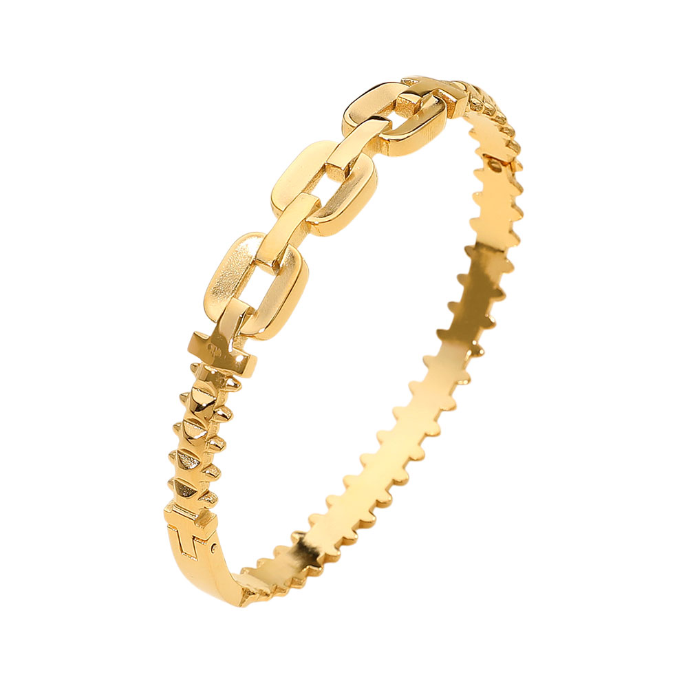 Details • Size : 0.4" H, 2.4" D • Hinged Closure • Water & Tarnish Resistant • Modern hinged bangle styled with bold sculpted links and textured detailing for a refined statement look. Designed for comfortable everyday wear, this versatile bracelet layers effortlessly or stands out on its own for polished, contemporary styling. • Stainless Steel