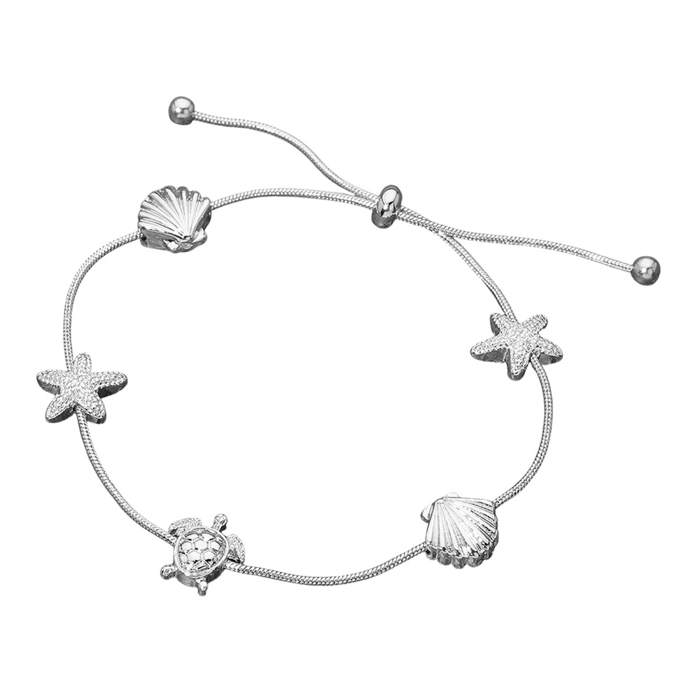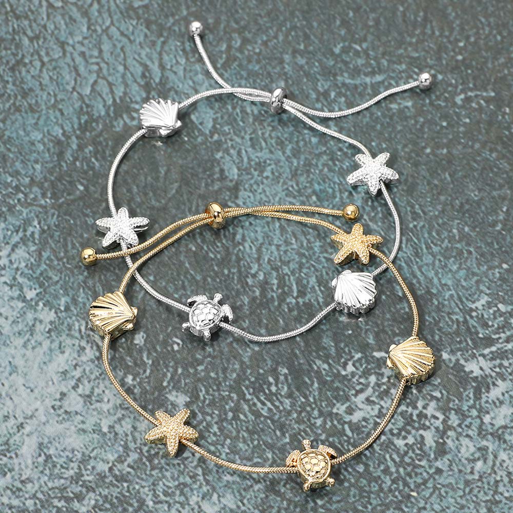 Details • Size : 0.4" H • Adjustable • This sea life charm adjustable slider bracelet features starfish, shell, and turtle accents arranged along a smooth sliding chain for an easy, customizable fit. Ideal for beach-inspired collections, summer accessories, resort gifting, and everyday styling with a playful ocean-themed touch. • Lead and Nickel Compliant