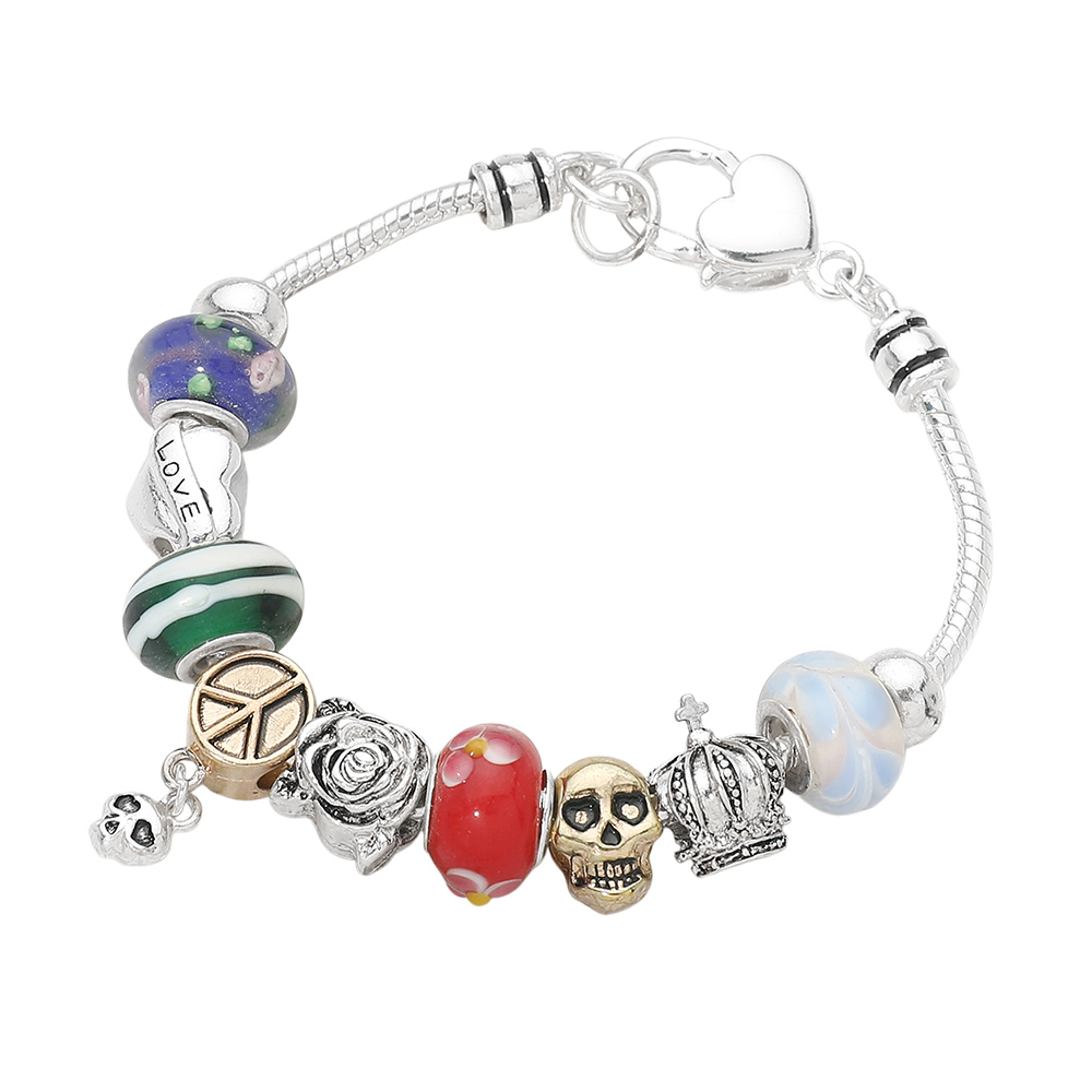 Details • Size : 0.6" H, 8" L • Lobster Clasp Closure • Unique multi charm bracelet featuring symbolic motifs such as peace, love, crown, rose, and skull accents. Designed to express individuality and layered meaning, this statement accessory adds personality to everyday outfits and makes a thoughtful gift for trend focused customers. • Lead and Nickel Compliant
