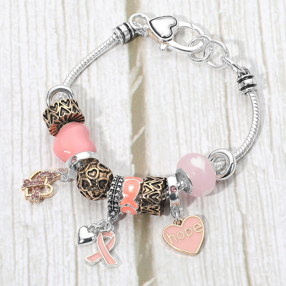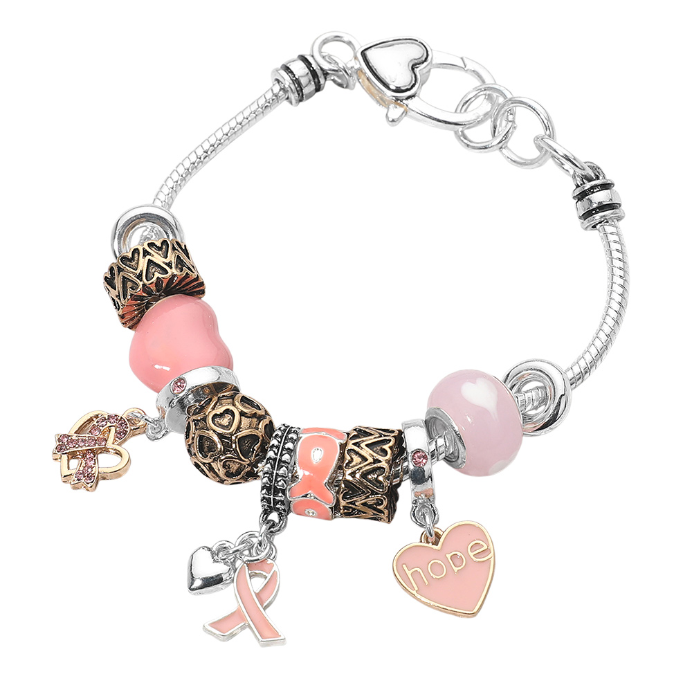Pink Ribbon Heart Hope Message Multi Bead Charm Bracelet
