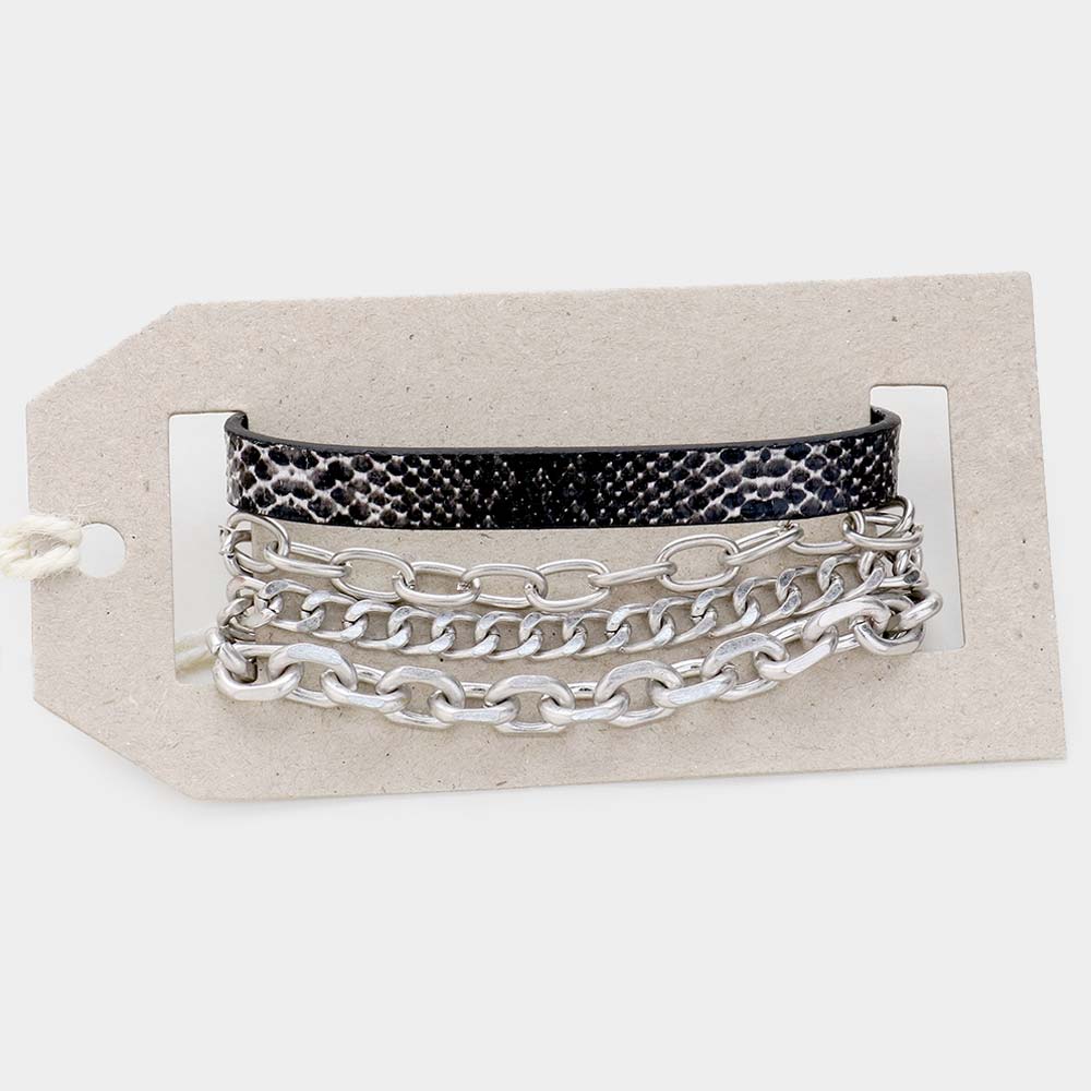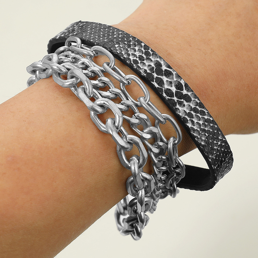 Details • Bracelet Size 1: 0.3"H, 7.5" L / Magnetic Closure • Bracelet Size 2: 0.5" H, 7" + 1.5" L / Lobster Clasp Closure • Elevate your accessories with this edgy layered bracelet featuring bold chain links paired with a sleek textured strap. Designed with a secure magnetic clasp for easy wear, it blends modern style with everyday comfort, making it a versatile piece for casual or statement looks. • Lead and Nickel Compliant