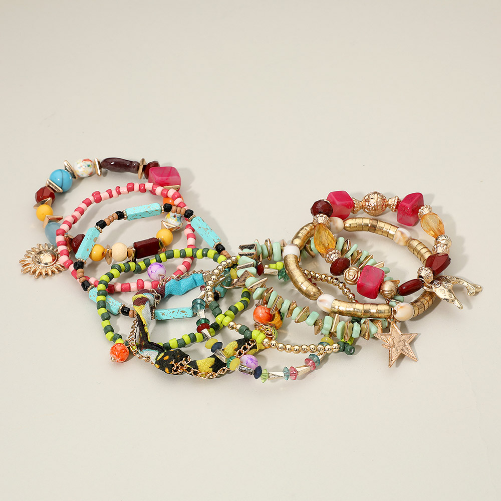 Details • Size 1 : 2" H / Stretchable • Size 2 : 0.4" H, 7" + 2" L / Lobster Clasp Closure • Boho dolphin star sun charm bracelet set featuring layered beaded strands with bold shapes, textured accents, and playful ocean-inspired motifs including a dolphin, star, and sun. Designed for stacking and stylish everyday wear, adding a vibrant artisan touch to casual outfits, festivals, vacations, and gifting occasions. • Lead and Nickel Compliant • Made In India