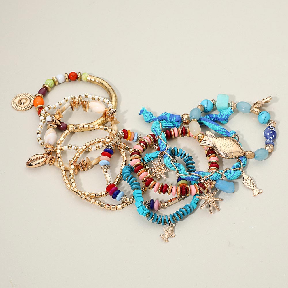 Details • Size 1 : 2" H / Stretchable • Size 2 : 0.3" H / Adjustable • Boho beach charm bracelet set featuring layered stretch strands with fish, seashell, and star accents, smooth and textured beads, and unique shapes for a playful coastal style. Perfect for stacking, gifting, and adding a fun ocean-inspired touch to everyday outfits and vacation looks. • Lead and Nickel Compliant • Made In India