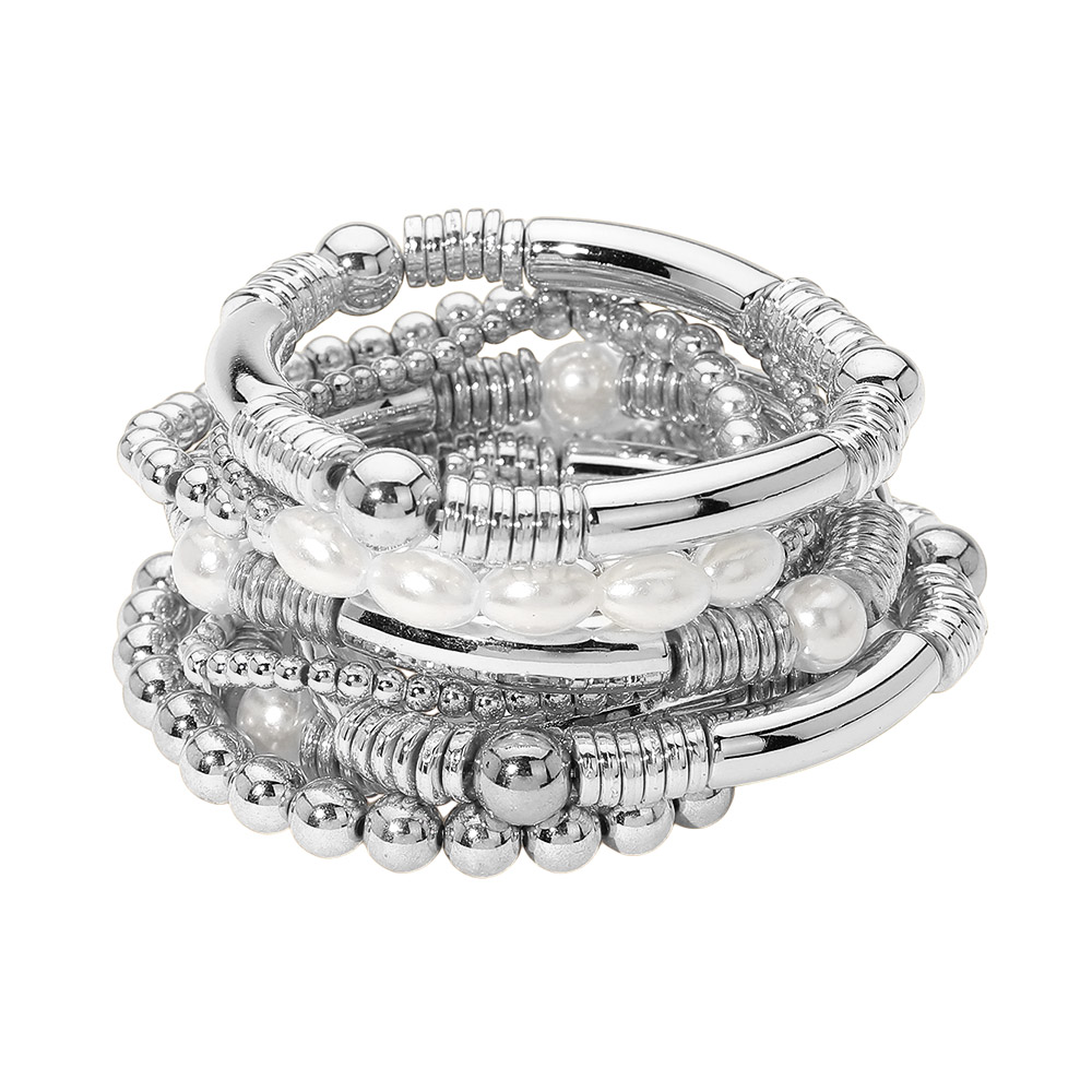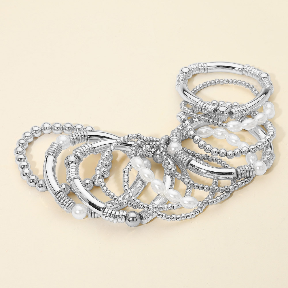 11PCS - Bold Pearl Metal Beaded Stretch Multi Layered Bracelets