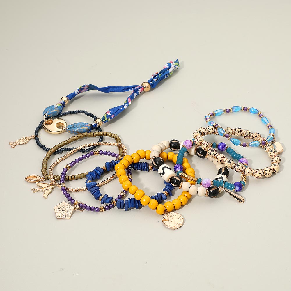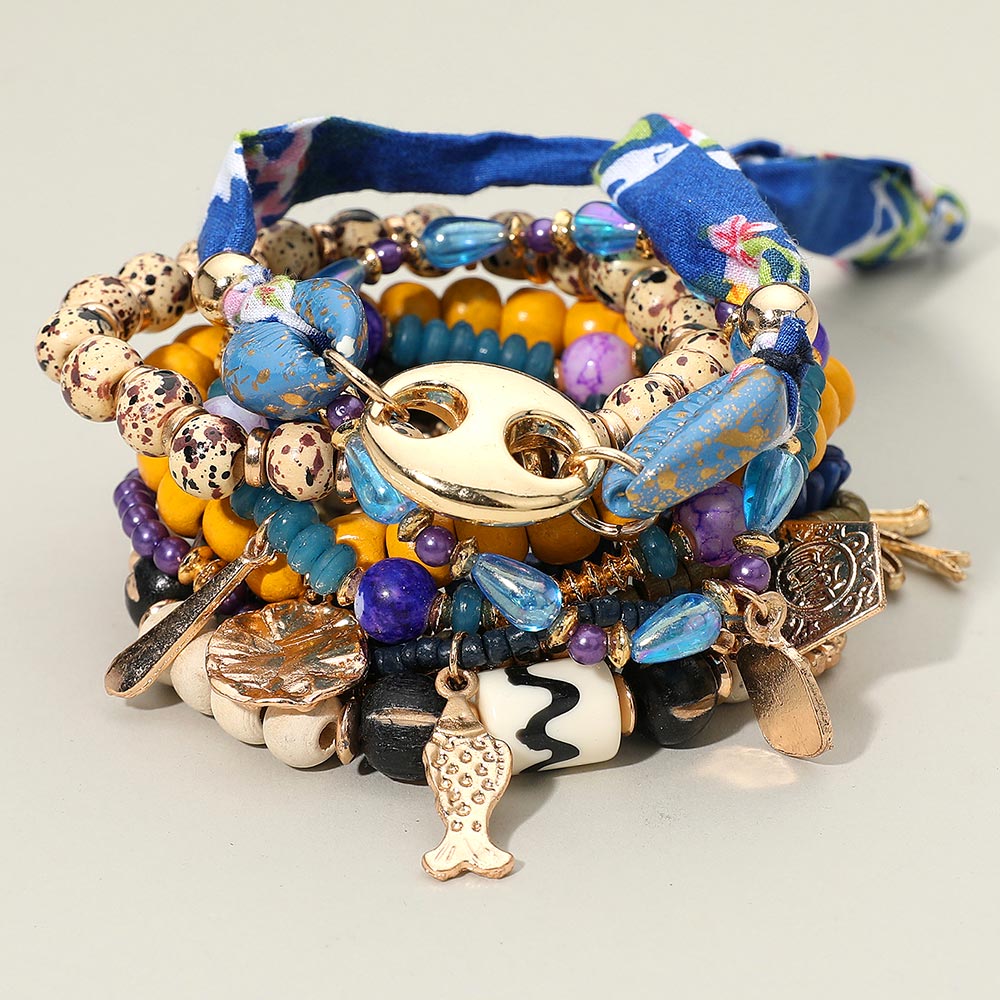 Details • Size 1 : 2.25" H / Stretchable • Size 2 : 0.5' H / Adjustable • Size 3 : 0.4" H, 7" + 2" L / Lobster Clasp Closure • A bold bracelet set featuring a lively mix of beads, playful charms, and patterned fabric accents. Designed for stacked styling, it adds effortless personality and movement to everyday looks while offering a fun, expressive accessory option. • Lead and Nickel Compliant • Made In India