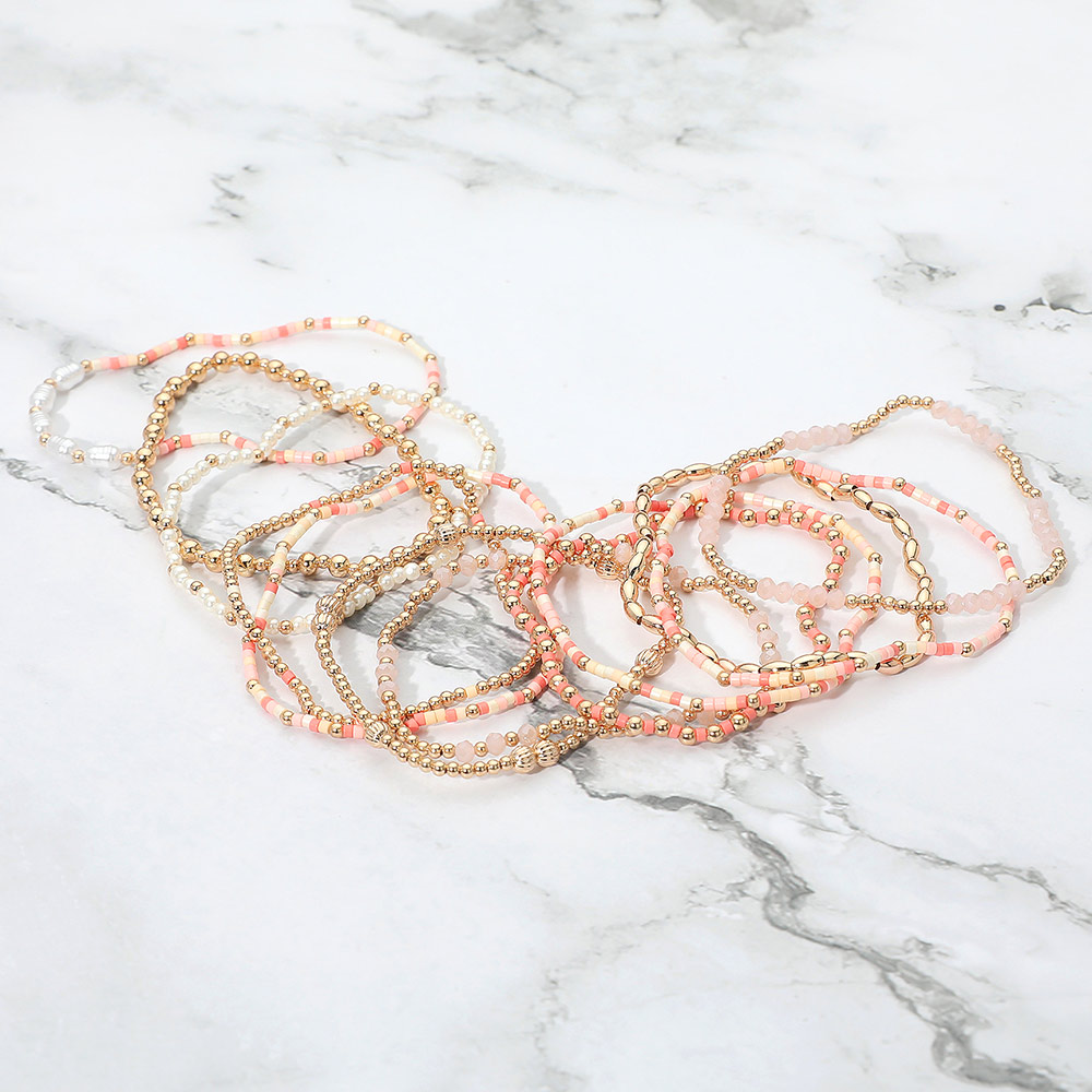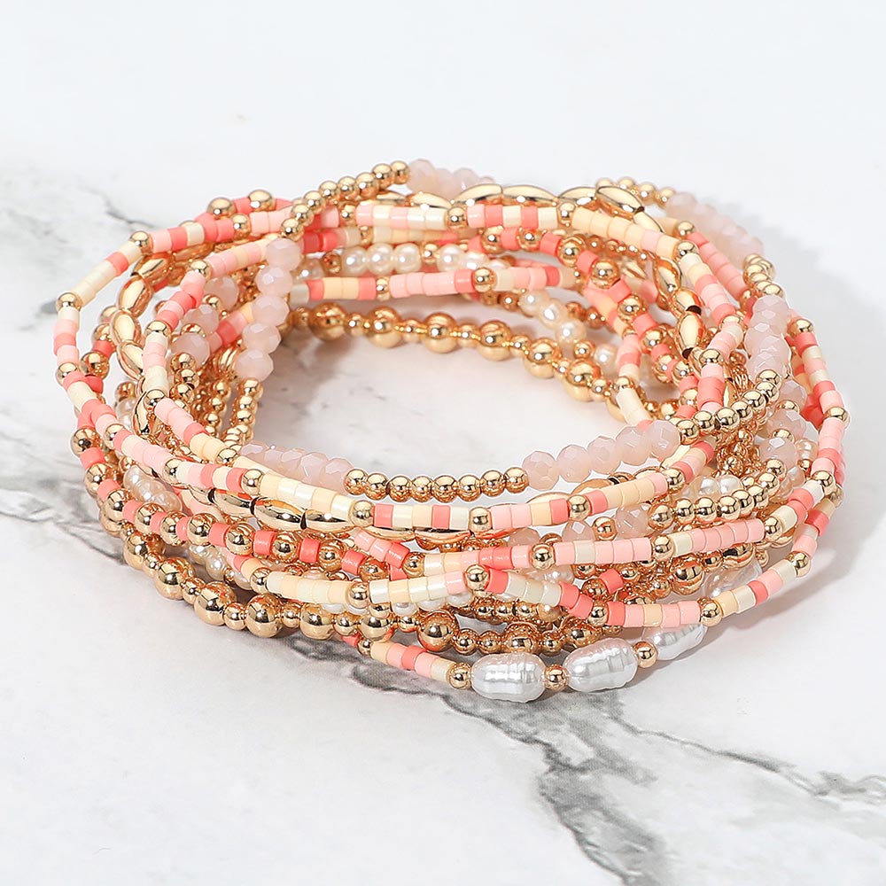 12PCS - Pearl Metal Ball Seed Faceted Beaded Stretch Multi Layered Bracelets