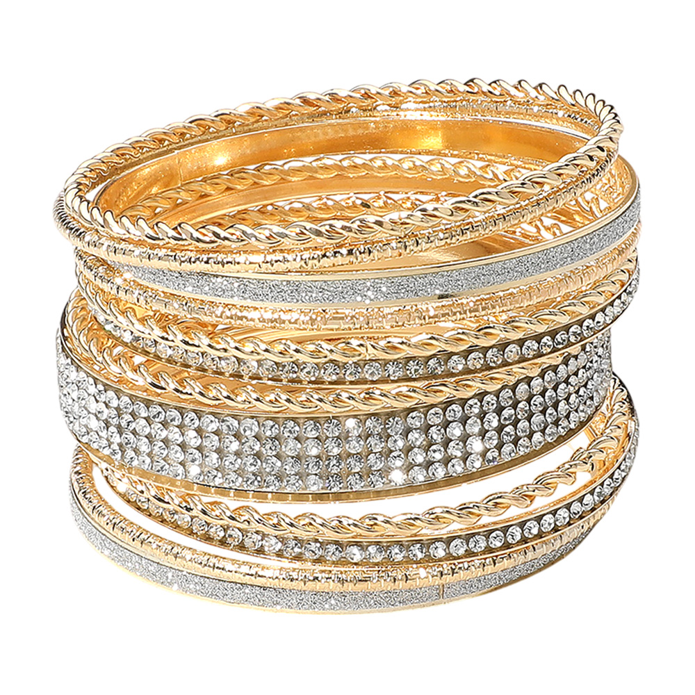 12PCS - Rhinestone Paved Glittered Twisted Textured Metal Bangle Stackable Multi Layered Bracelets