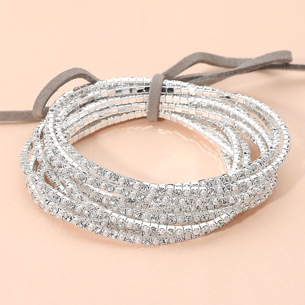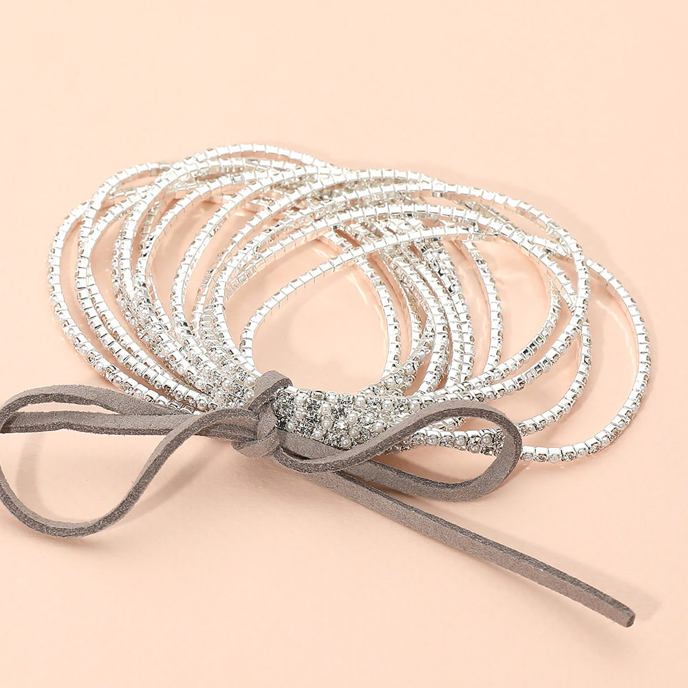 12PCS - Ribbon Slim Rhinestone Stretch Multi Layered Bracelet