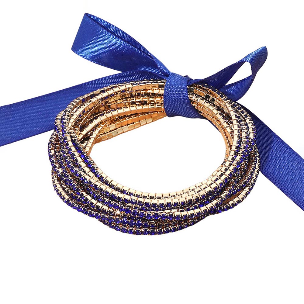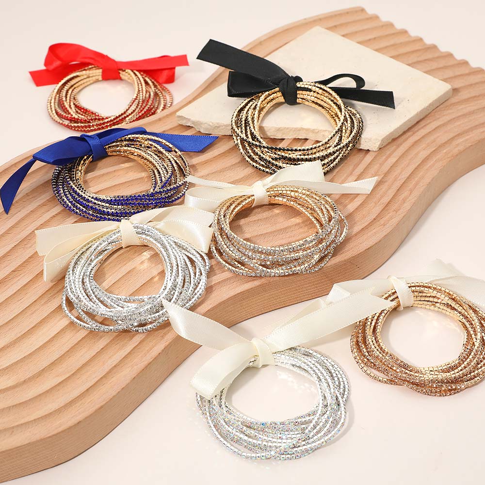 12PCS - Ribbon Slim Rhinestone Stretch Multi Layered Bracelet