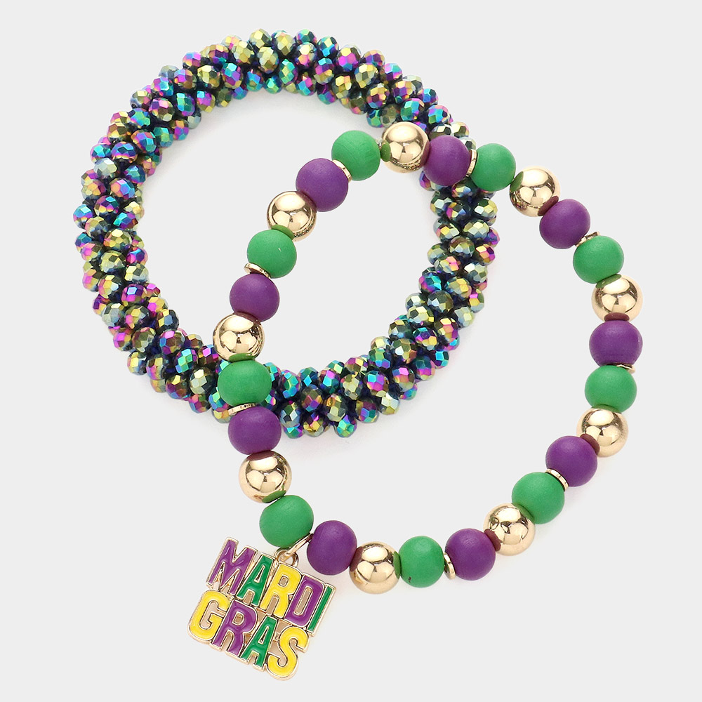 2PCS - Mardi Gras Message Charm Wood Ball Faceted Beaded Stretch Bracelets