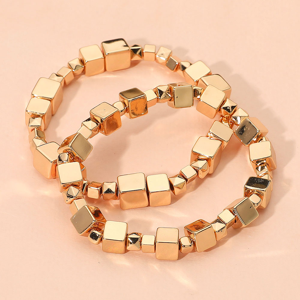 Details • Size : 0.6" H • Stretchable • This geometric cube stretch bracelet set features bold, modern shapes with a polished finish. Its versatile stacked design adds an edgy yet chic touch to any outfit, making it a standout accessory for both casual and dressy occasions. • Lead and Nickel Compliant