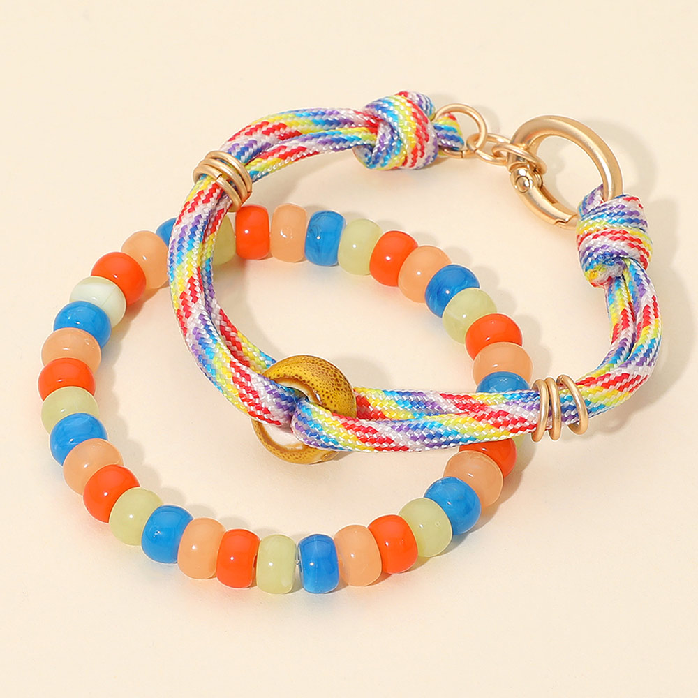 Details • Size 1 : 0.5" H, 8" + 0.75" L / Lobster Clasp Closure • Size 2 : 0.3" H / Stretchable • This beaded rainbow rope bracelet brings playful energy to any look with its vibrant mix of textures and lively accents. Designed for easy, everyday wear, it adds a fun pop of personality whether worn solo or stacked, making it a cheerful accessory for any casual style. • Lead and Nickel Compliant