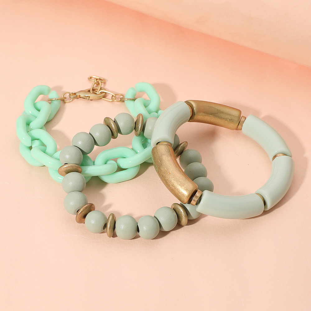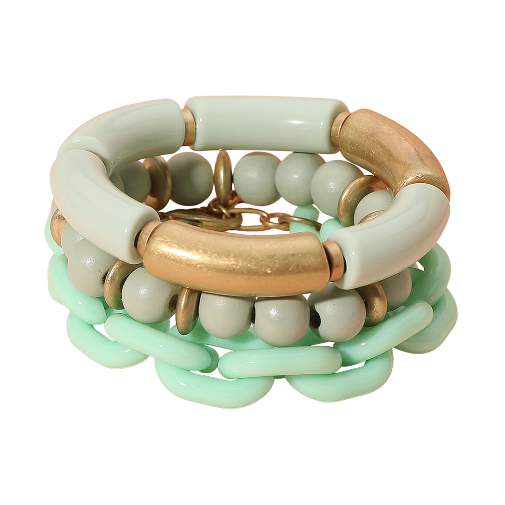 3PCS - Bold Wooden Mixed Beaded Stretch Resin Link Multi Layered Bracelets