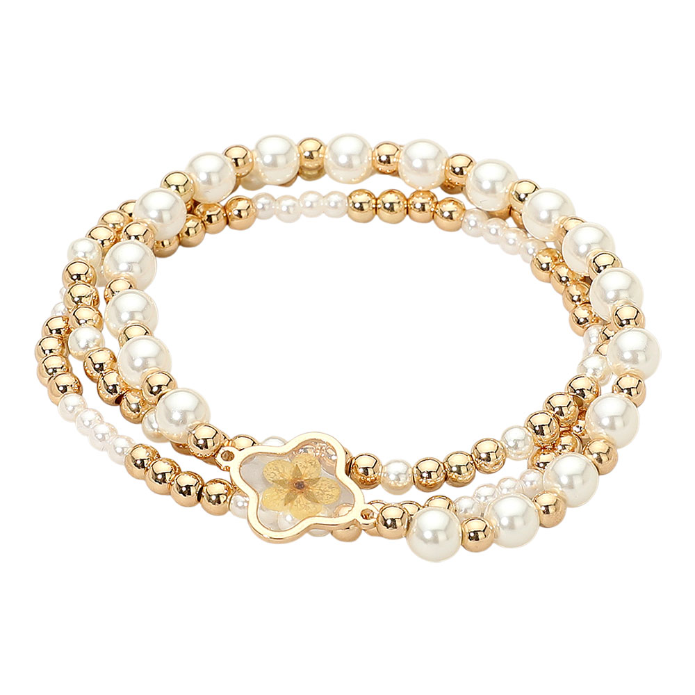 3PCS - Floral Accent Pearl Metal Ball Beaded Stretch Multi Layered Bracelets